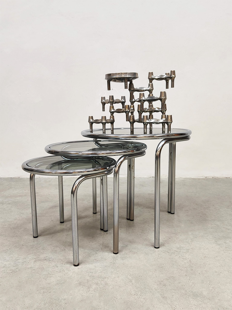 Italian design mimiset chrome & smoked glass side tables vintage chromen bijzettafels 1970