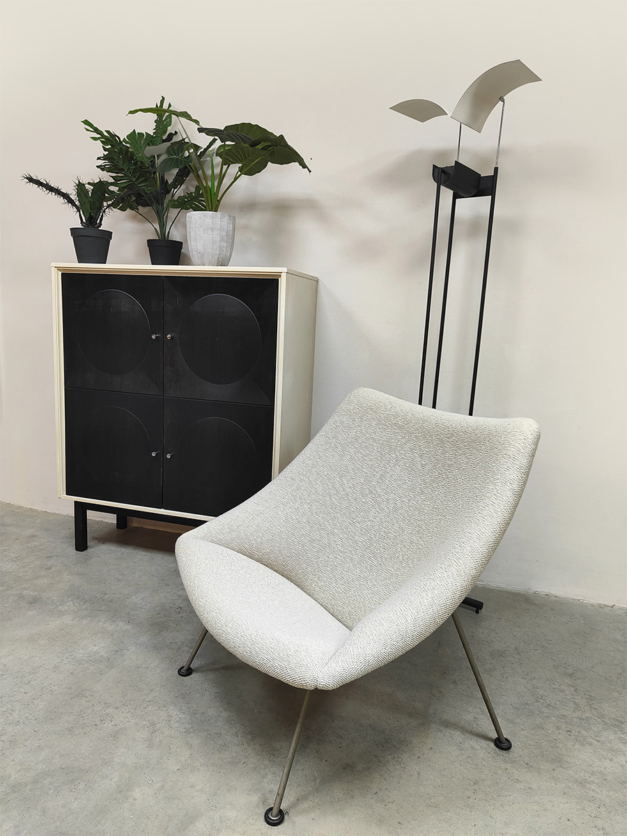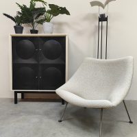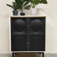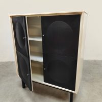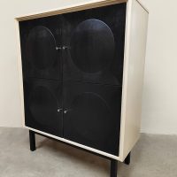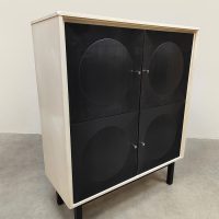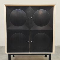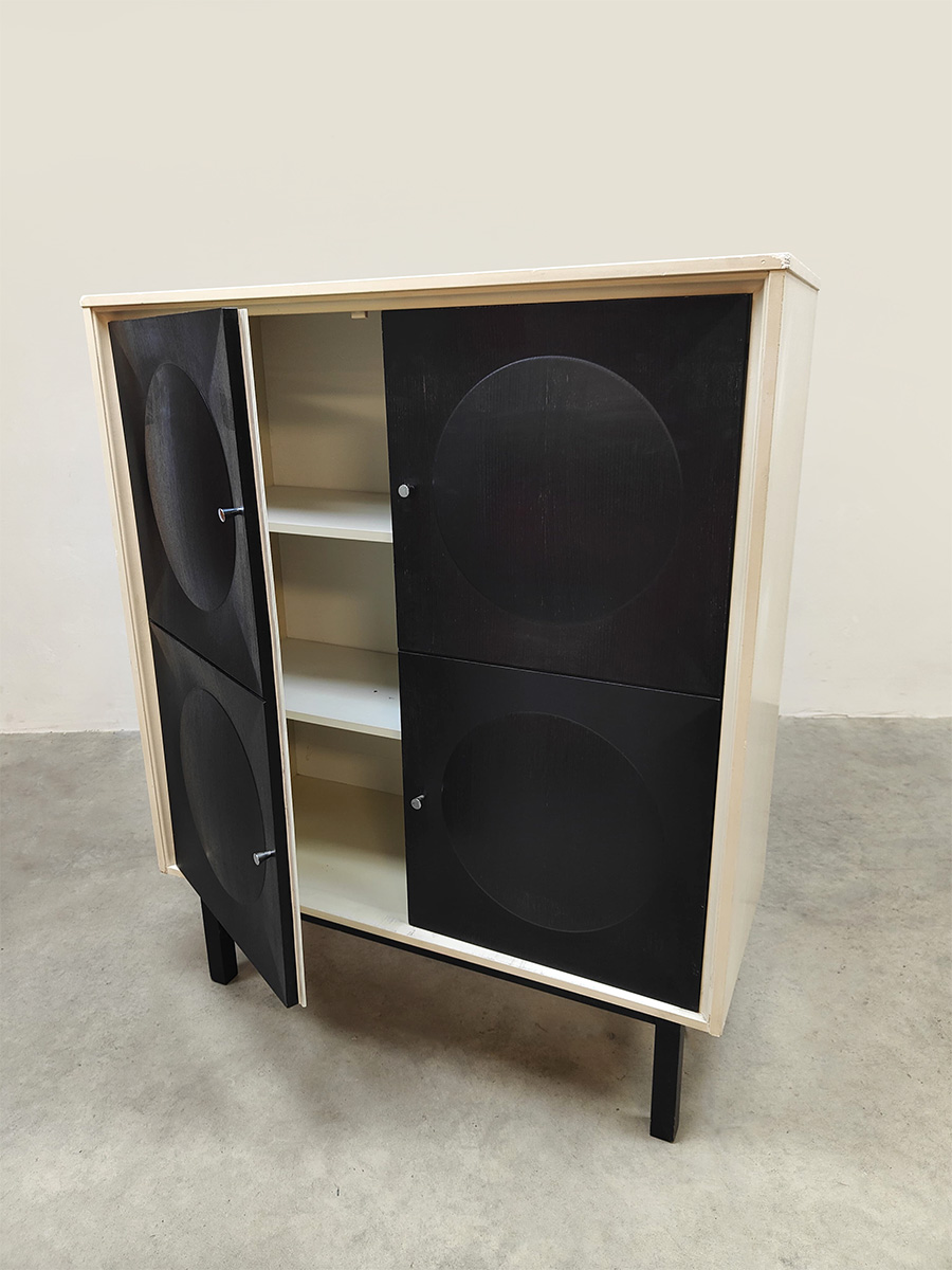 Graphic, daring and delightfully striking. This brutalist cabinet from the 70s has it all: a sleek black front with relief circles, subtle knobs and a light frame for that contrast that makes your heart beat faster. Perfect as a storage unit, bookcase or style statement in your interior. Considering its age, this cabinet is in a used vintage condition. Do you already have the perfect place for this beautiful cabinet?