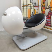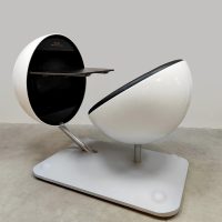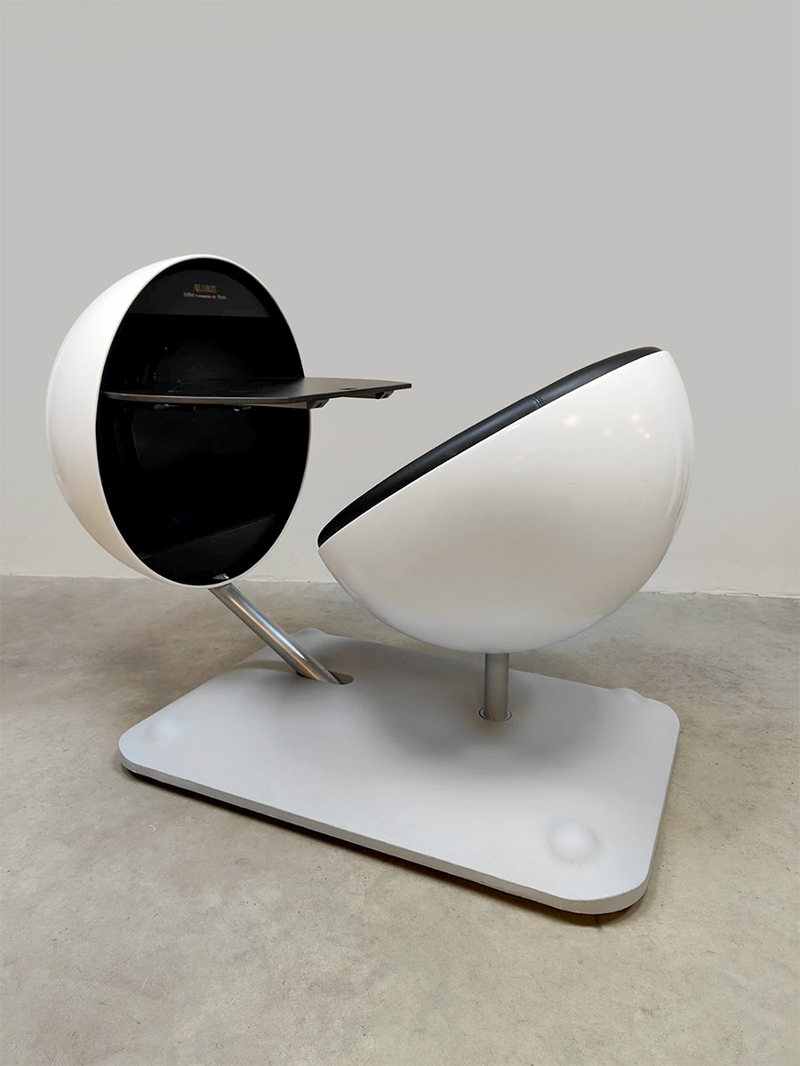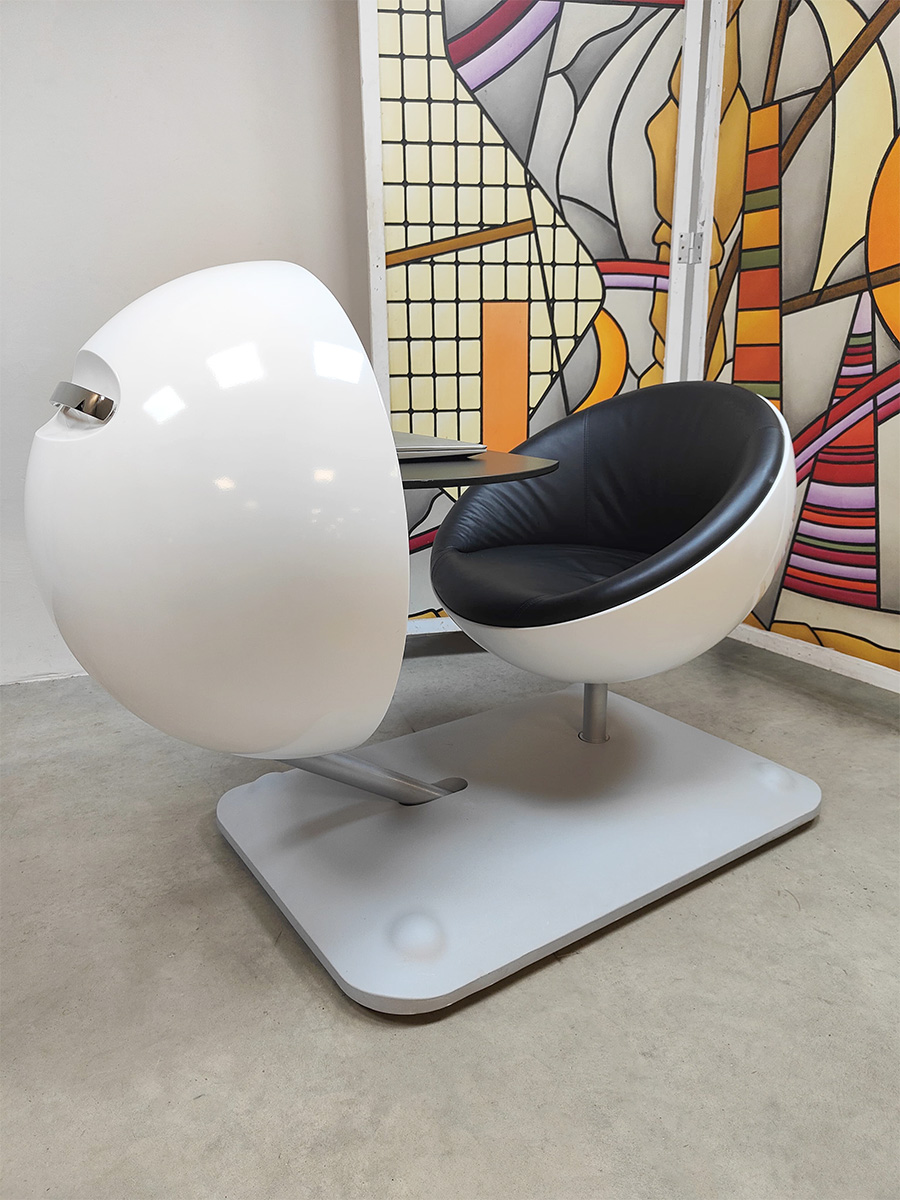 Work in style! An iconic example of Dutch design from the Space Age period. The Globus Workplace combines functionality and futuristic design in one sculptural object. Designed by Michiel van der Kley for Artifort & Gispen. This mobile workstation is both a statement piece and a practical solution for flexible working. The sphere opens up into a full-fledged workstation with desk and chair, and closes again into a stylish, almost alien-looking sphere. Considering its age, it is still in good vintage condition. Perfect for design enthusiasts who want to combine work and aesthetics. The Globus is rarely on the market. A unique opportunity for enthusiasts of timeless design, innovative work solutions and collectible objects. Do you have the perfect place for this unique piece?