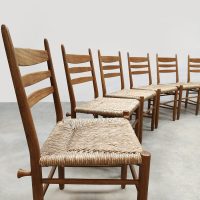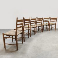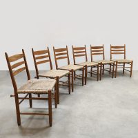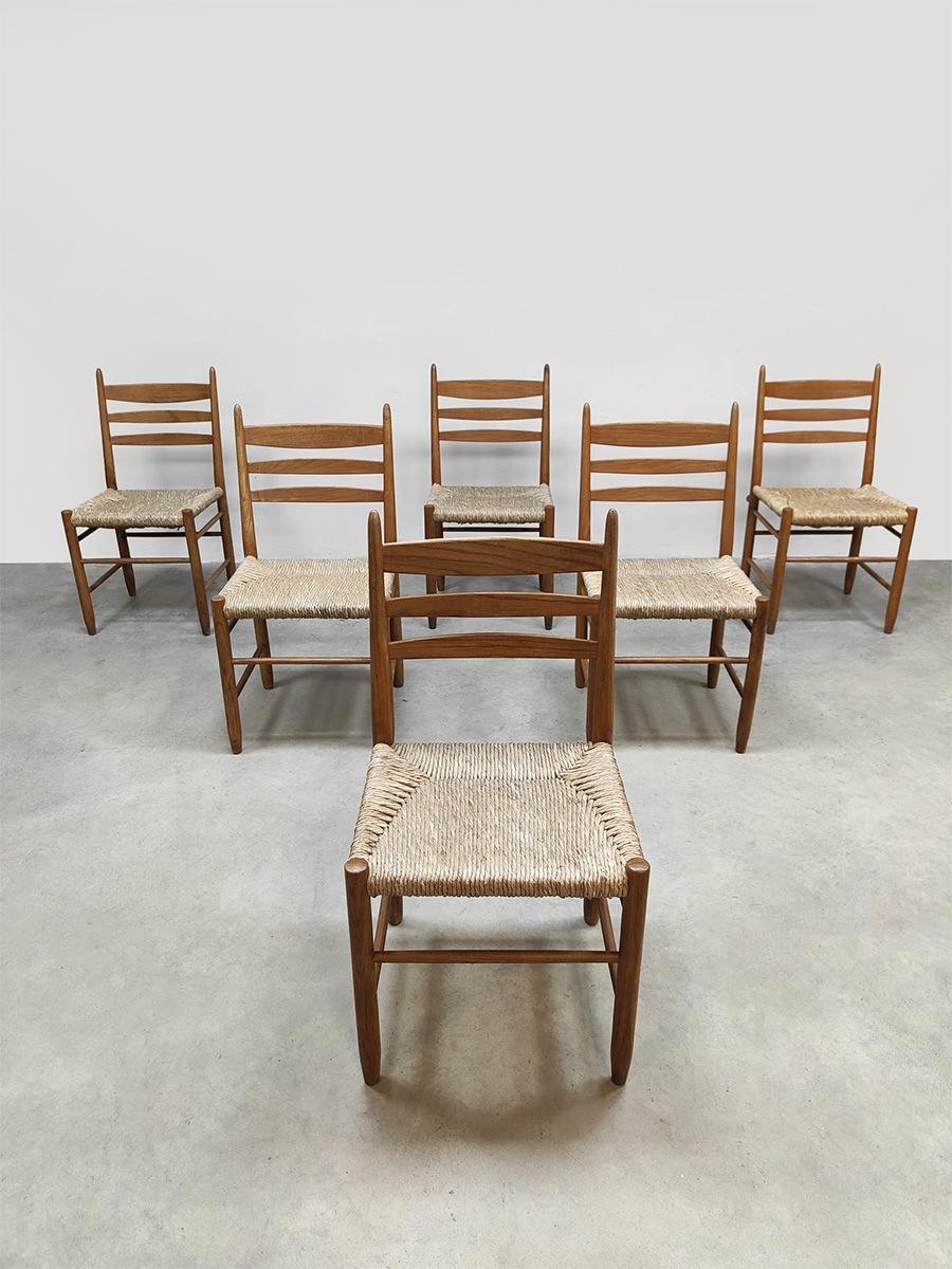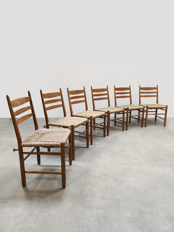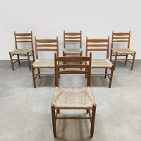 This beautiful set of 6 vintage teak dining chairs with a papercord seat fit perfectly into the Wabi Sabi living style of today. Period: 1960. Still equipped with the original rush papercord seat. Considering the age in well-used vintage condition. These natural chairs definitely show character and are timeless. Beautiful for at the table in the living room, kitchen or for the interior of your restaurant or hotel. Wabi Sabi vibes all over the place! Timeless elegance.