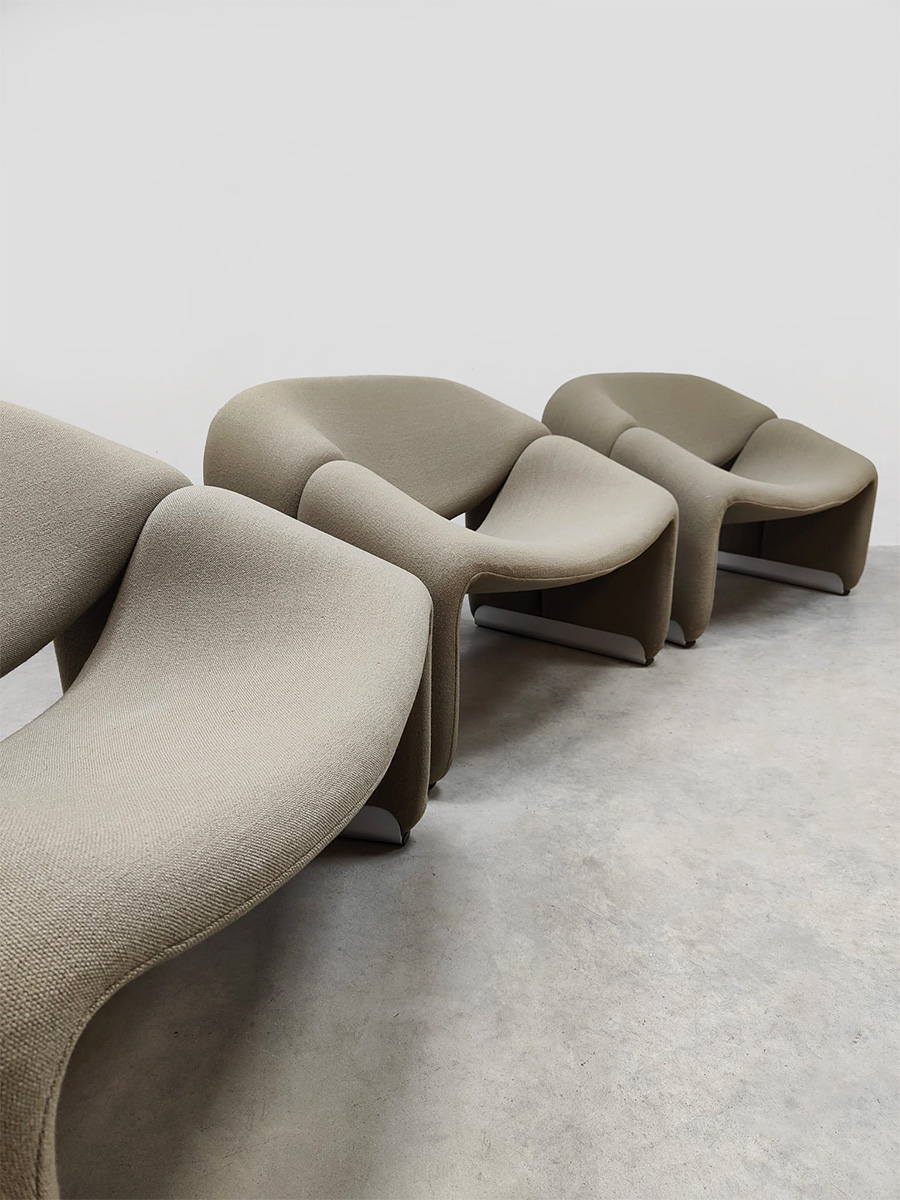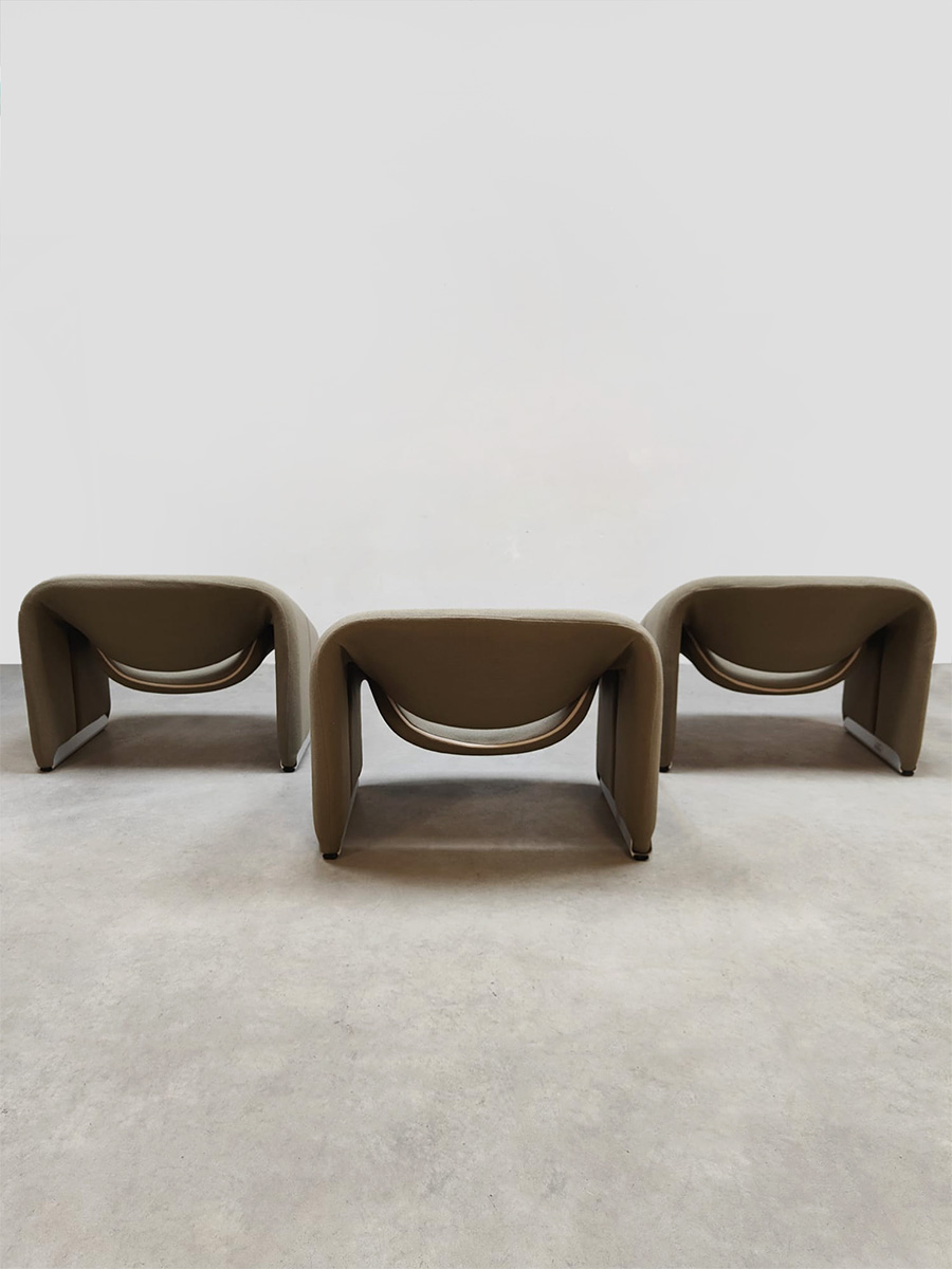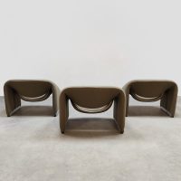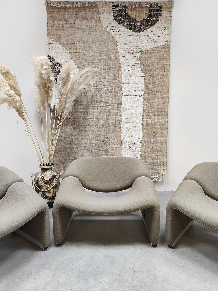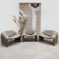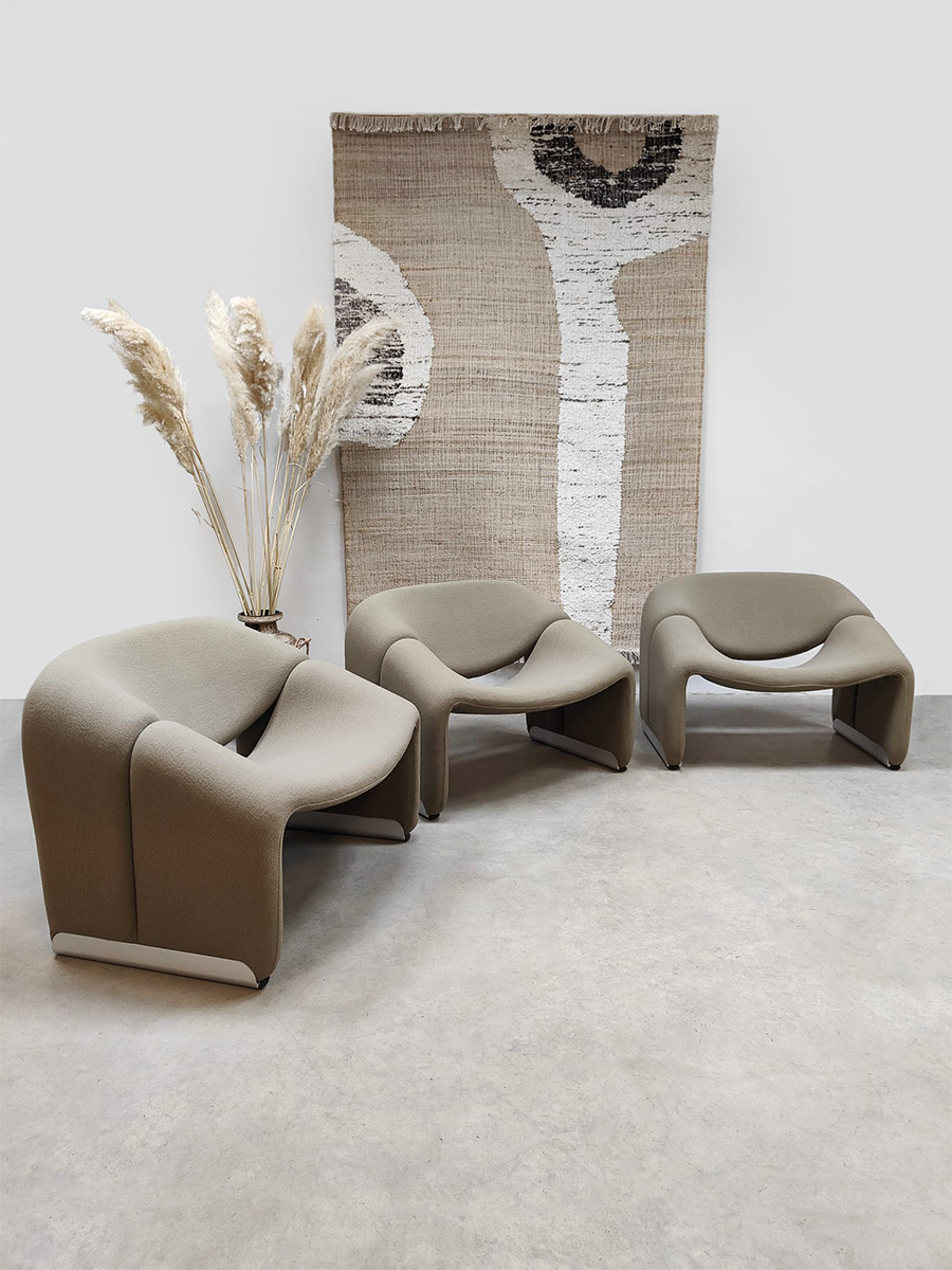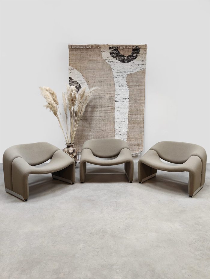 Three of a kind, these original Artifort easy chairs are a real must have for design lovers. Model F598. Known as the ‘Groovy’ armchair. The chair is also called the M-chair because of the tubular structure and offset in the middle that resembles the letter M. Produced by Artifort and designed by the well-known Pierre Paulin. Still provided with the original fabric & fitted with an aluminium profile at the bottom. Considering its age still in a very good vintage condition. Due to its limited dimensions, it looks spacious in its environment. Absolutely a beautiful, quirky & playful design with wonderful seating comfort. Will this special set soon be showing off in your interior? Timeless Dutch design!
