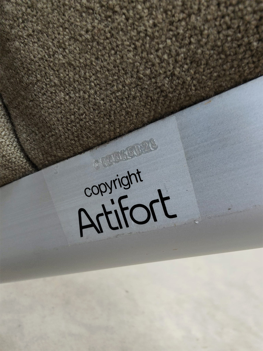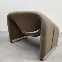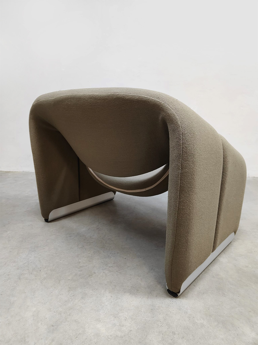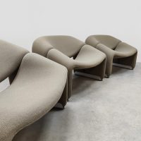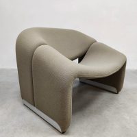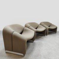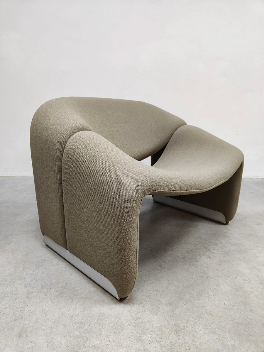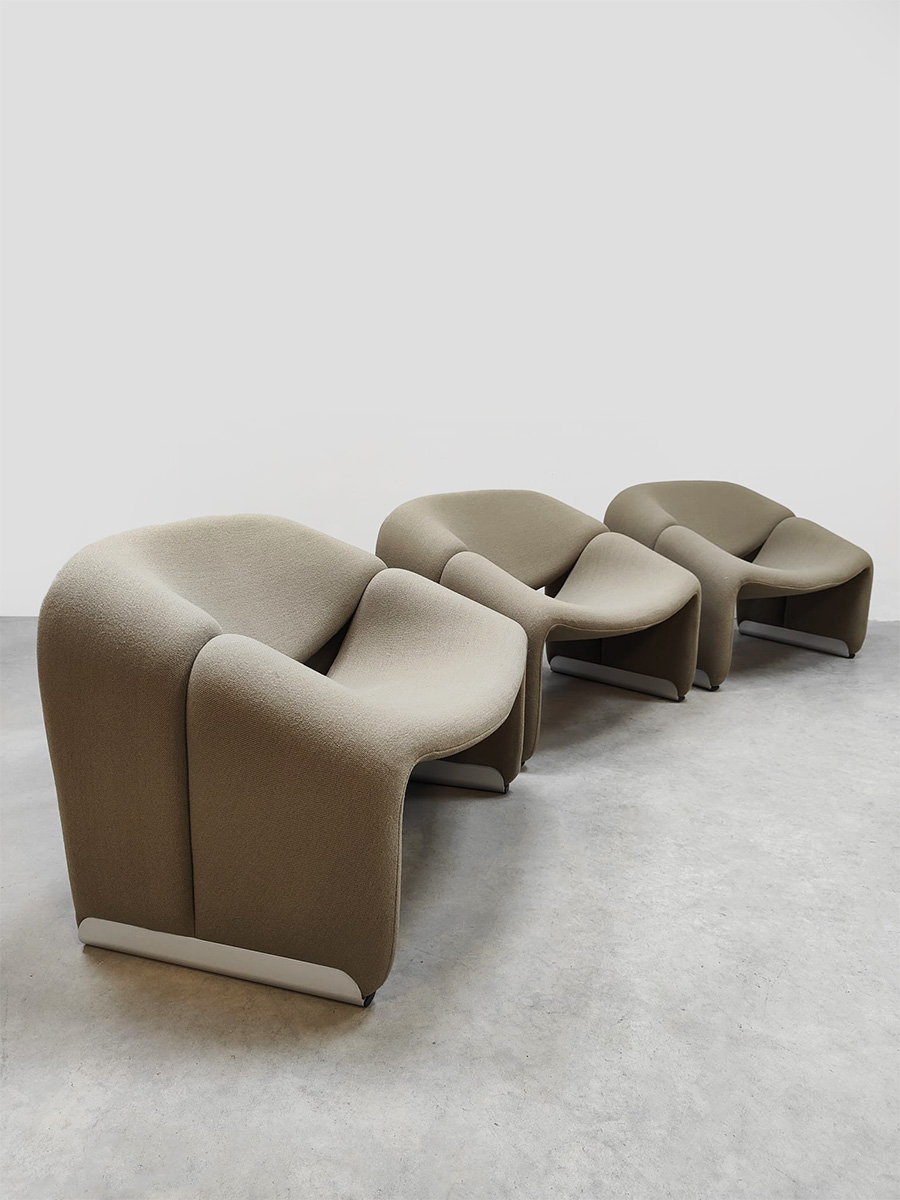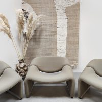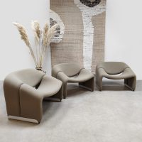 Three of a kind, these original Artifort easy chairs are a real must have for design lovers. Model F598. Known as the ‘Groovy’ armchair. The chair is also called the M-chair because of the tubular structure and offset in the middle that resembles the letter M. Produced by Artifort and designed by the well-known Pierre Paulin. Still provided with the original fabric & fitted with an aluminium profile at the bottom. Considering its age still in a very good vintage condition. Due to its limited dimensions, it looks spacious in its environment. Absolutely a beautiful, quirky & playful design with wonderful seating comfort. Will this special set soon be showing off in your interior? Timeless Dutch design!