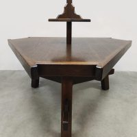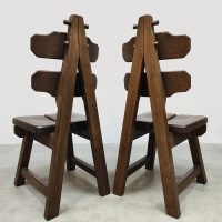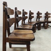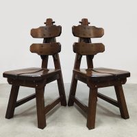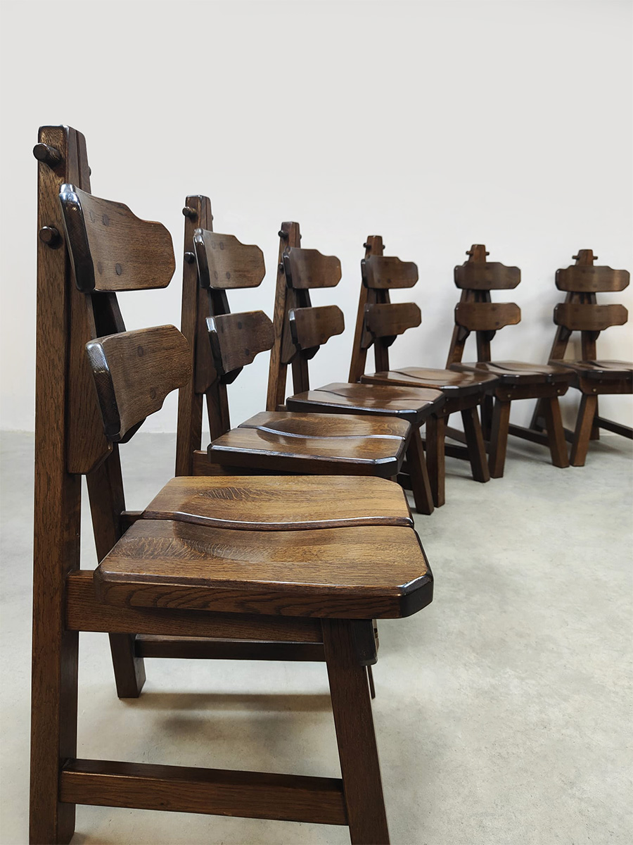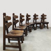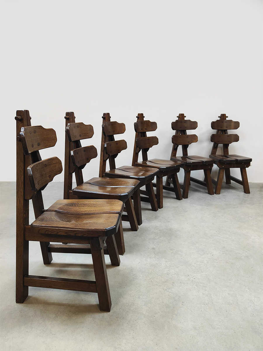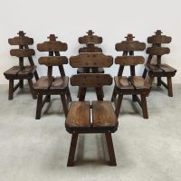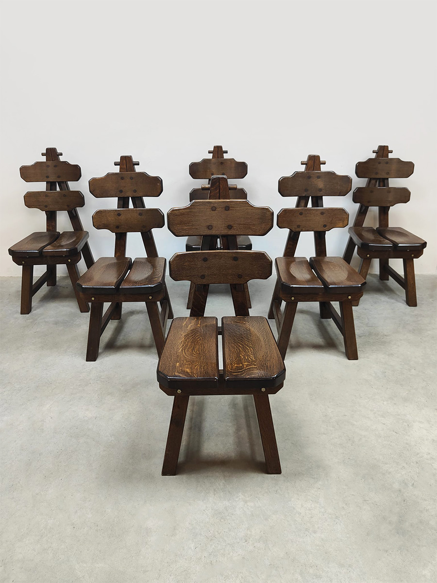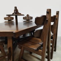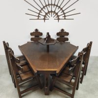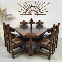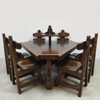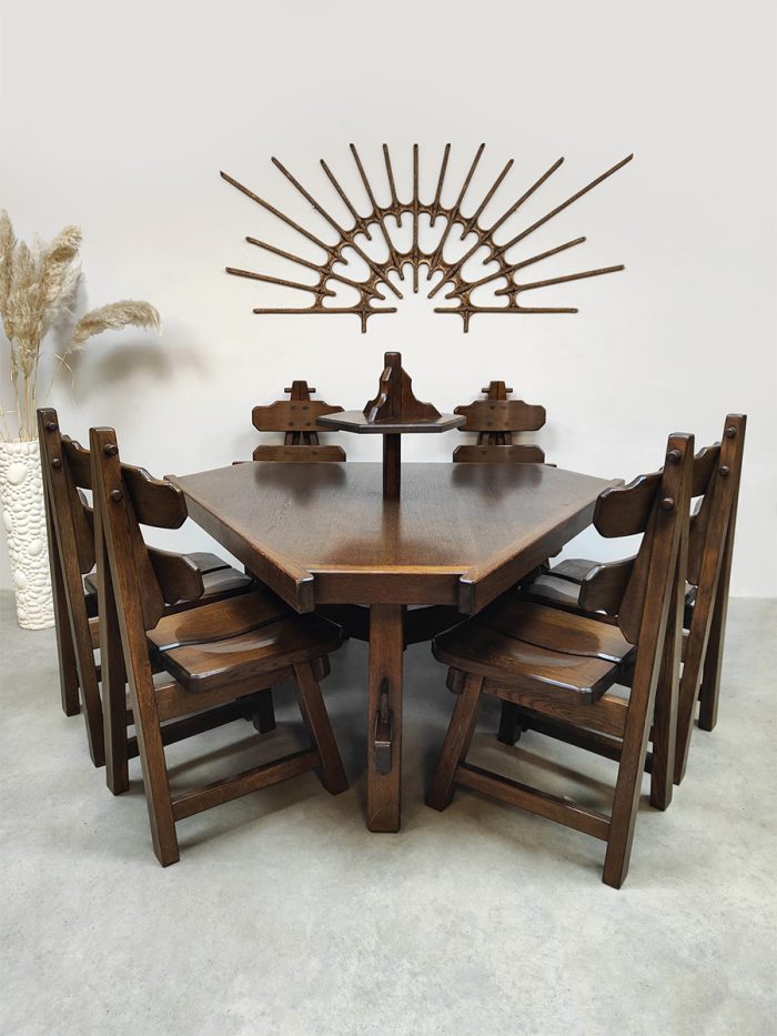 What a catch, you either love it or hate it! This brutalist vintage dining set, consisting of six solid oak chairs and a large, triangular dining table with a central centerpiece, is not something you will come across very often. Period: 60s-70s. Country of origin: Spain. The vintage chairs are real eye-catchers due to the wooden sculptural and geometric design, rough details and visible connections that radiate strength and stability. This vintage dining set is in a very good vintage condition considering its age. Do you already have a place for this unique dining set? Just a little bit different than usual. Dinner time it is!