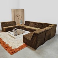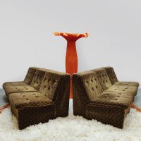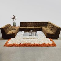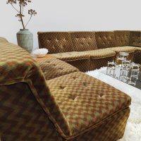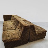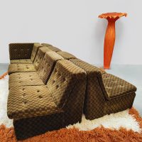 Back to the seventies! With this beautiful vintage modular velvet lounge sofa. Period: 70s. Country of origin: Germany. A comfortable lounge sofa that still has the original velvet upholstery in a bi-color checkered pattern. Thanks to the 8 separate elements, you can place this groovy sofa entirely according to your own wishes. Considering its age, it is still in good vintage condition. A unique eye-catcher for a living room, but also fantastic as a lounge sofa in a hotel or restaurant. Lounge time it is.