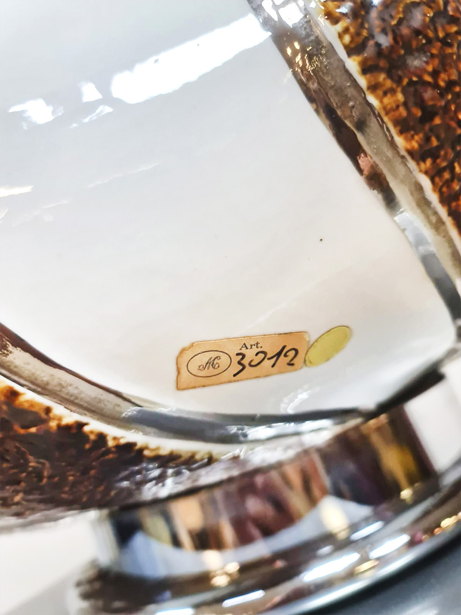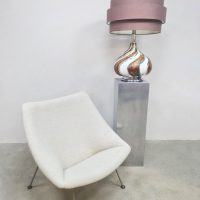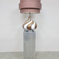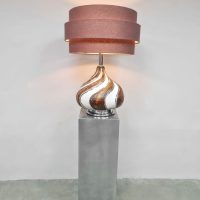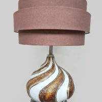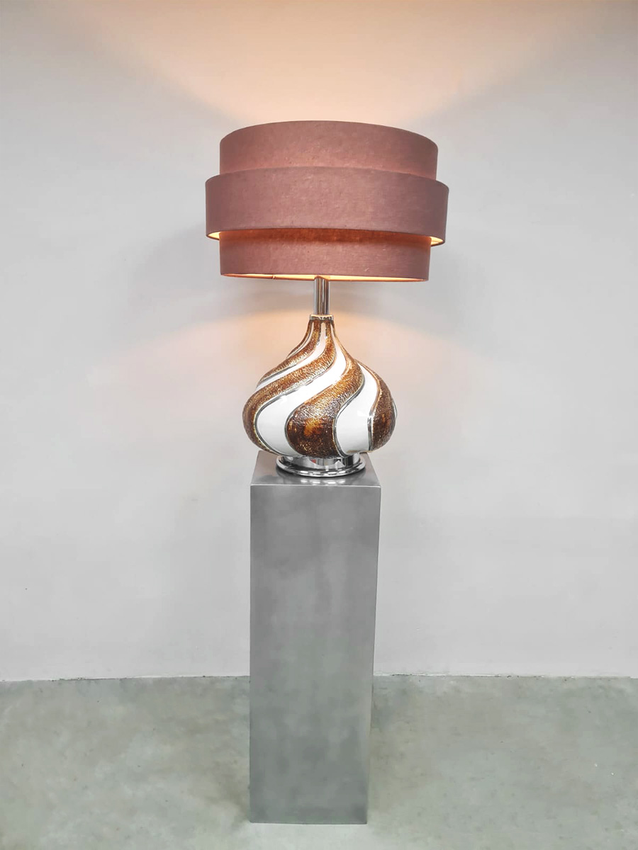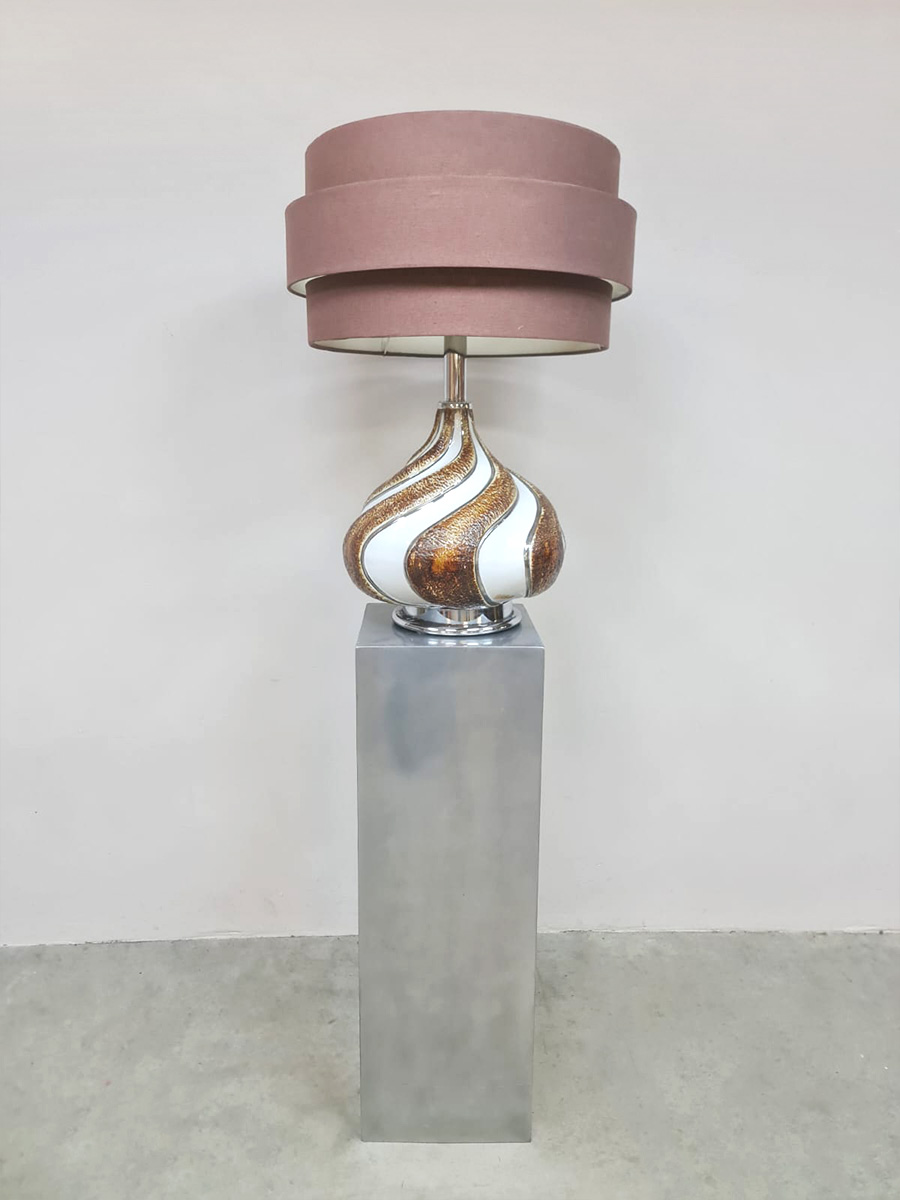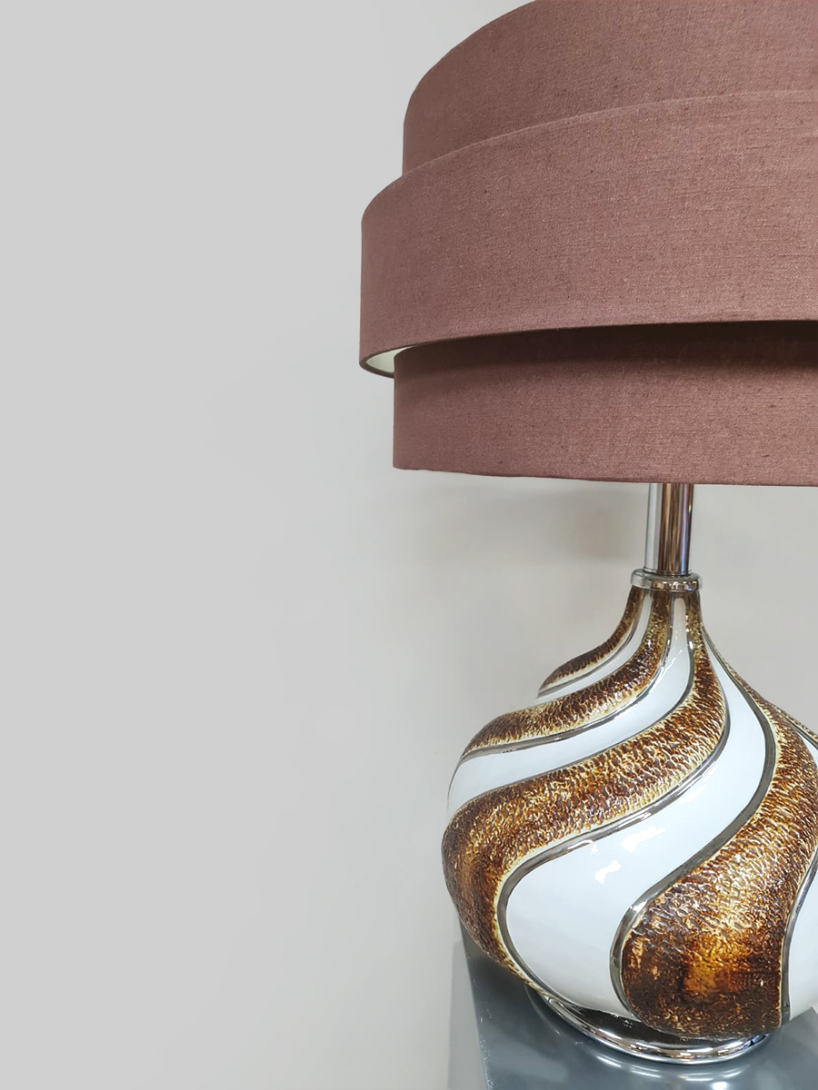 Swirling glamour! This vintage Italian table lamp is an absolute eye-catcher. The imposing ceramic base with golden-brown swirl patterns exudes pure luxury and is reminiscent of the Kremlin domes. Chic, bold, and a touch mysterious. The double fabric shade in a warm brown hue completes the look and provides a soft yet atmospheric light. Considering its age, this lamp is in good vintage condition. Do you already have a place for this unique lamp in your home?