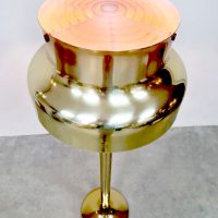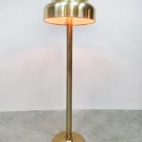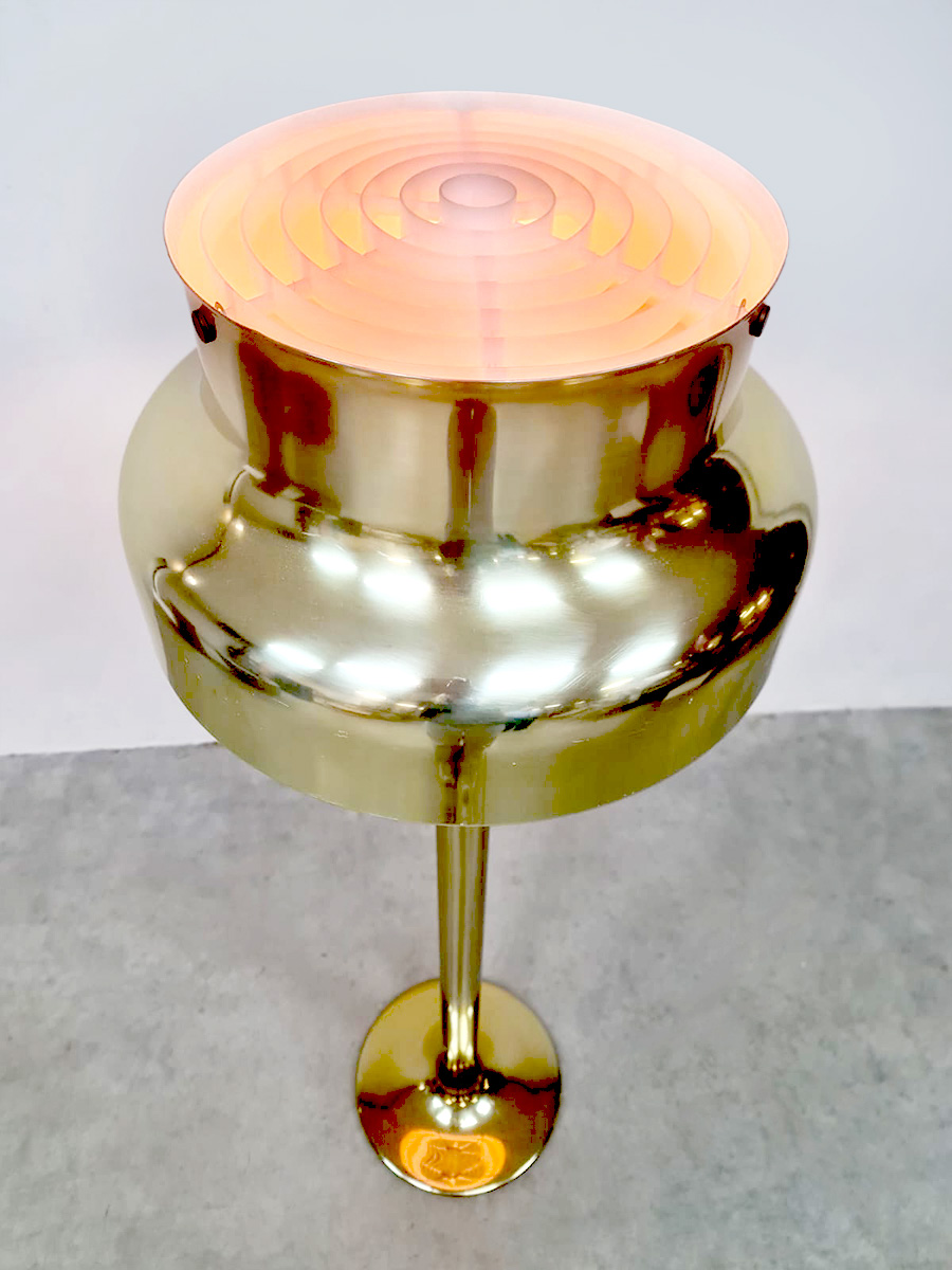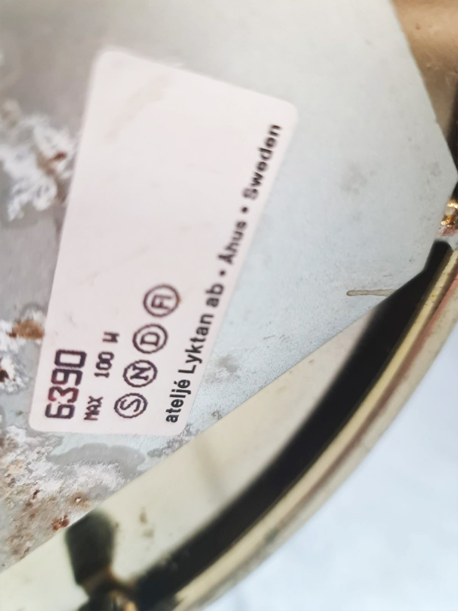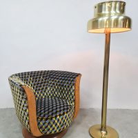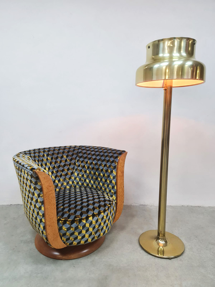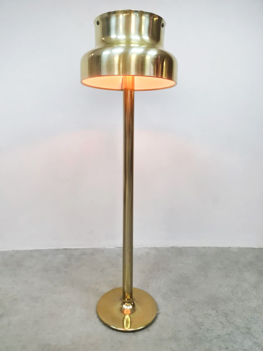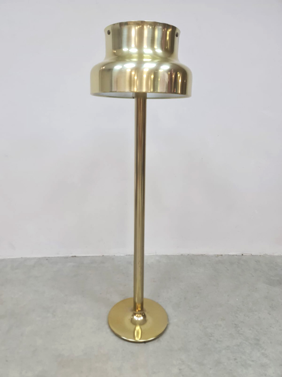 Shine like gold! This Bumling floor lamp by Ateljé Lyktan is a true design classic! The lamp still has the original brand sticker. This floor lamp was designed in the 60s by Anders Pehrsson in Sweden, but is just as modern and popular today as it was then. The lamp is in a good used vintage condition (has a small dent in the shade) A unique piece for the connoisseur. Due to its luxurious appearance, this lamp is a true statement piece for the living room.
