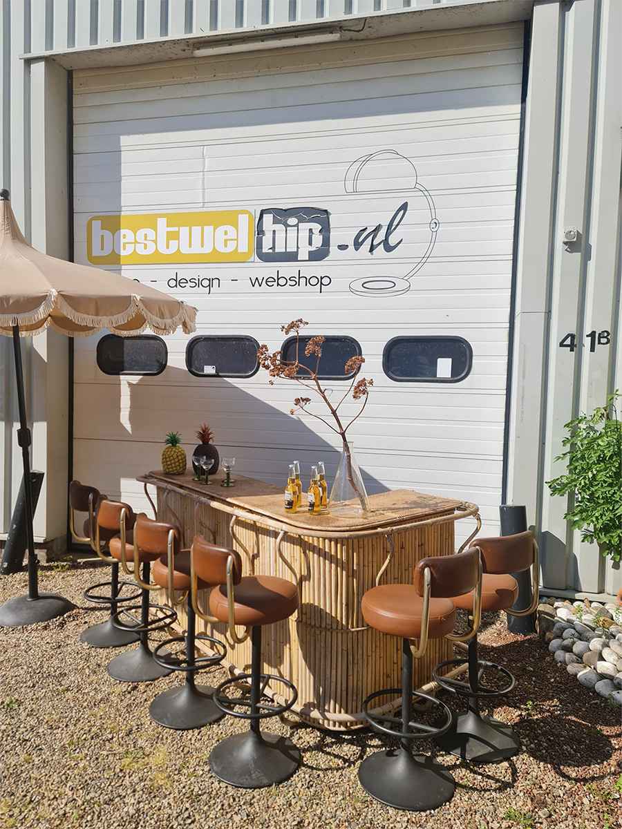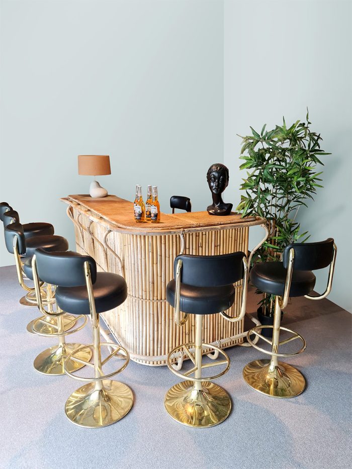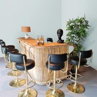 Bring summer into your home with this awesome XXL vintage tropical bamboo cocktail bar. Country of origin: France. Period: 60s-70s. This bar has a large worktop and at the back of the bar there is a shelf to store items/bottles and glasses. Considering its age in a used vintage condition. Bring tropical vibes into your home or mancave with this awesome bar. Let the summer begin, cheerio!