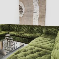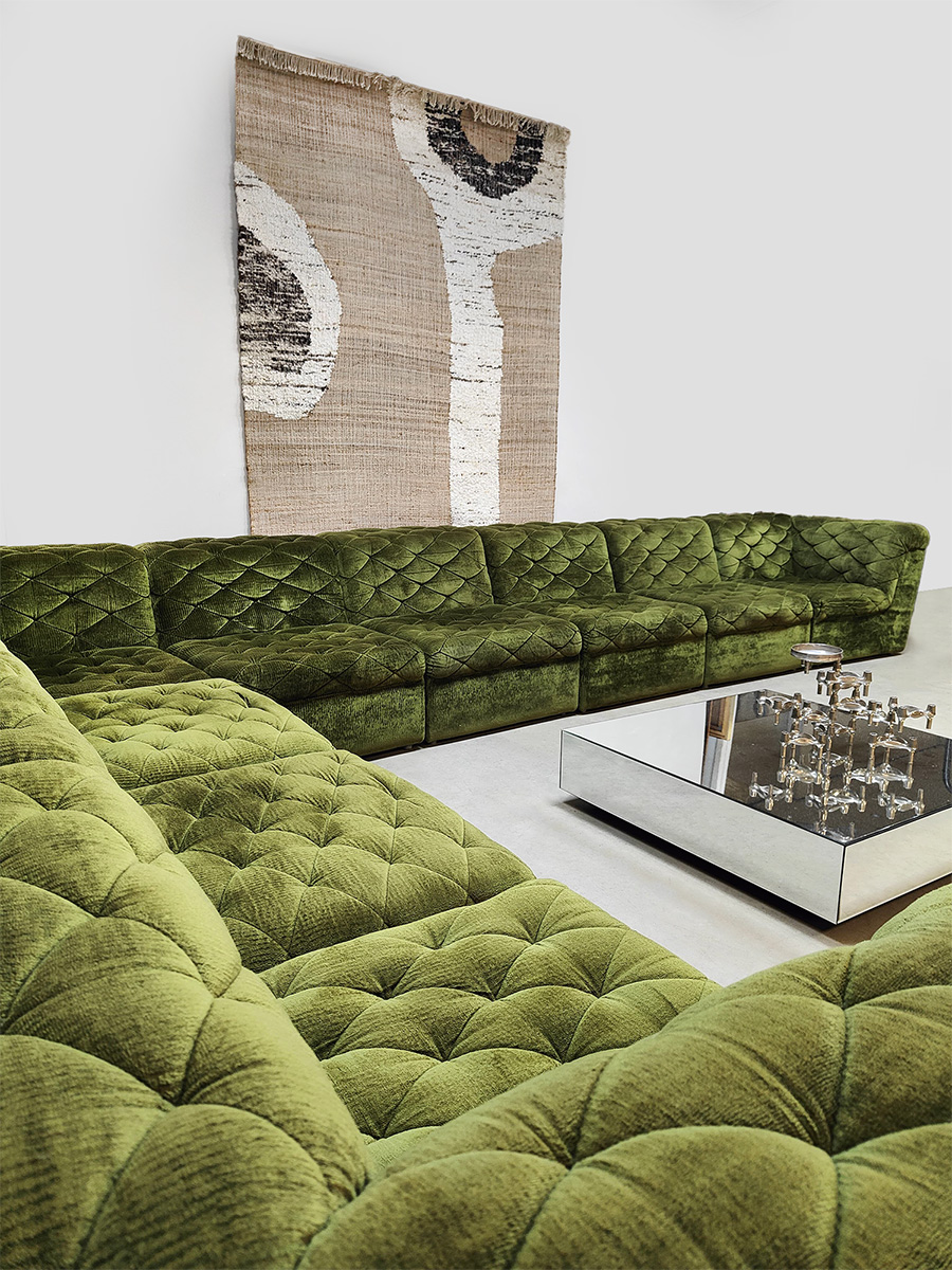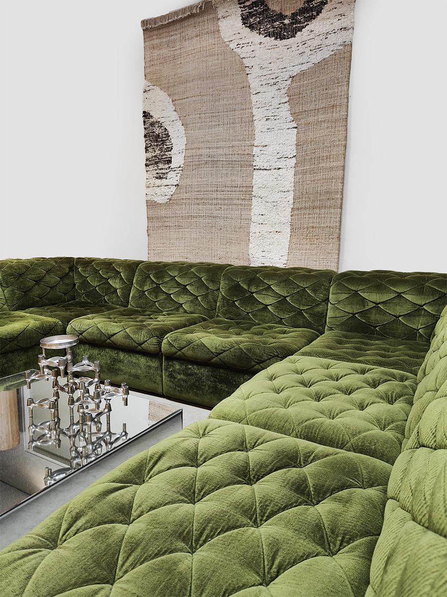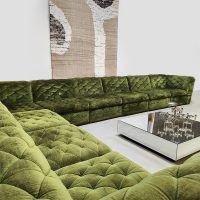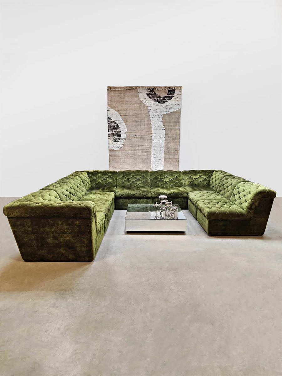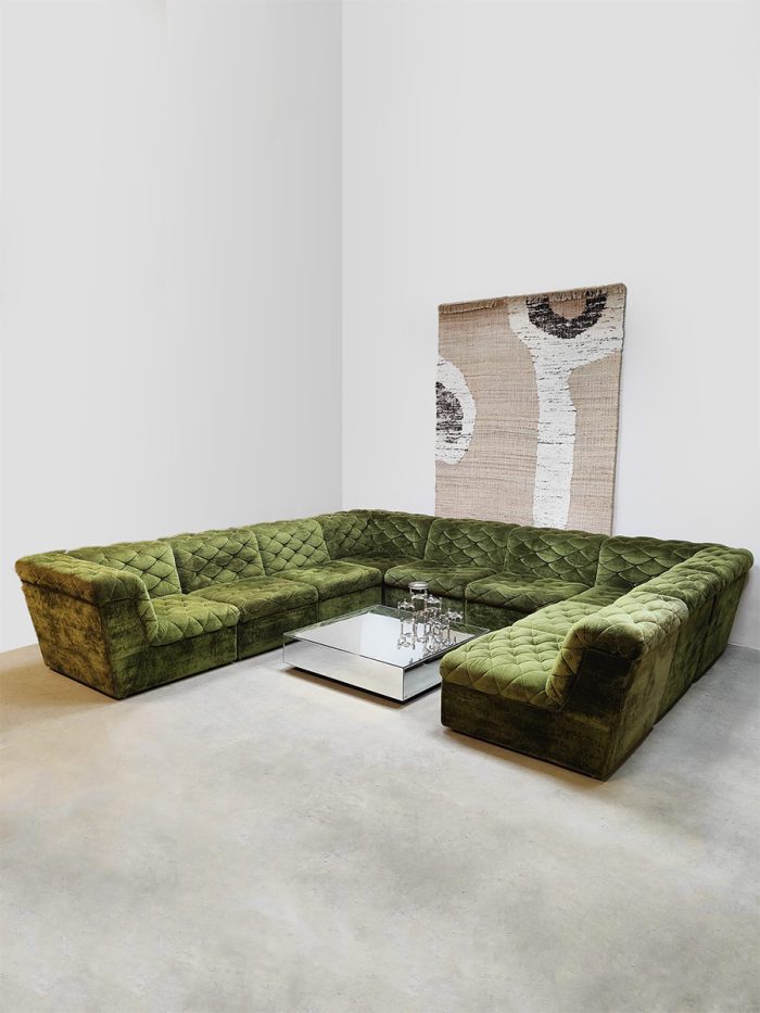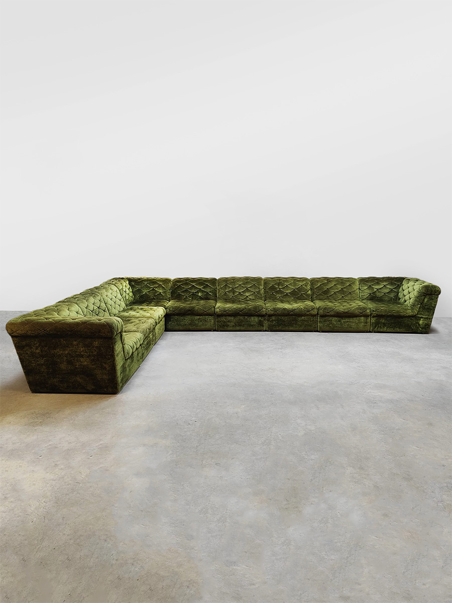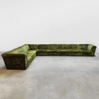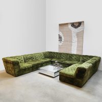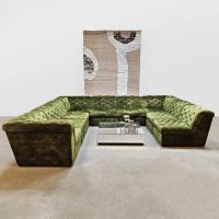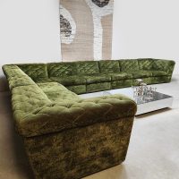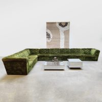 What an eye-catcher… this beautiful XXL modular vintage design lounge sofa! Consisting of 9 separate elements that can be arranged according to your own wishes. Including 6 straight parts and 3 corner parts. This crazy vintage element sofa has very comfortable seating comfort and is provided with a beautiful green velvet upholstery. Period: 70s. You can arrange this sofa according to your own wishes, making multiple combinations possible. Considering its age, this sofa is still in good vintage condition. Who wouldn’t want to sink into this wonderful large modular lounge sofa with a good book or a nice glass of wine? Beautiful for the living room, but also ideal as a lounge sofa in a hotel or restaurant. Take a seat and relax!