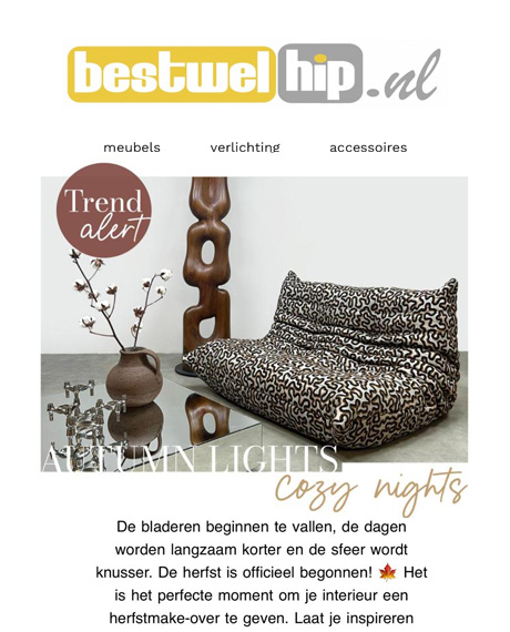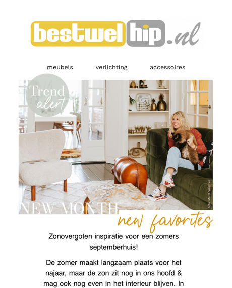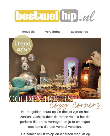 Iedere maand verstuurt Bestwelhip een nieuwsbrief met de laatste nieuwe items en uitgelichte trends. Meld je aan voor de nieuwsbrief, of lees hier de voorgaande nieuwsbrieven terug.