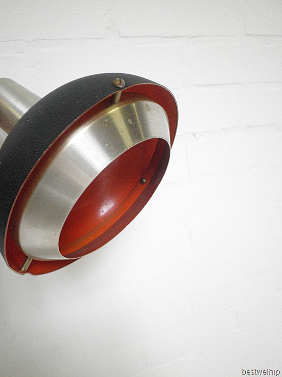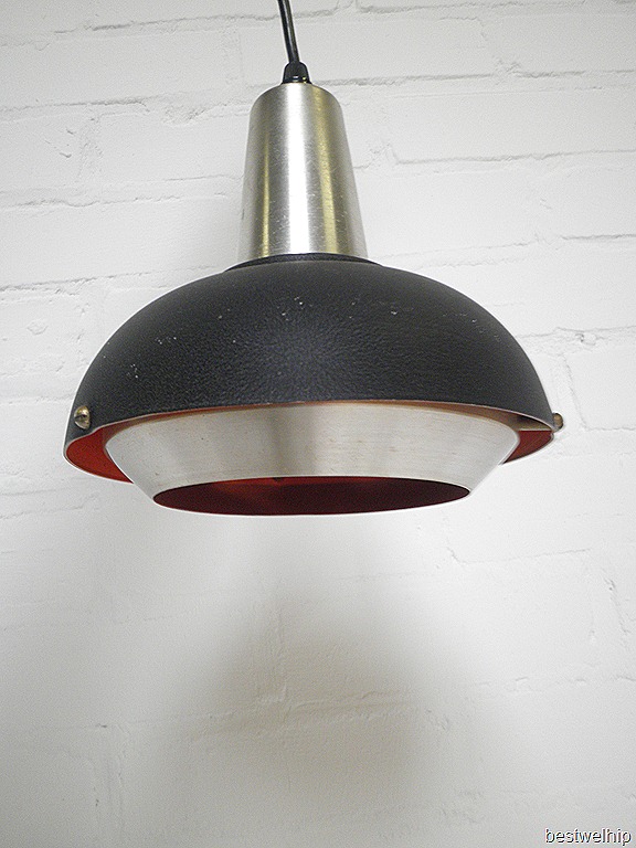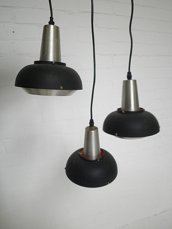 Helemaal hip zijn deze 3 industriële metalen hanglampen. In bescheiden afmetingen, doorsnede kapje is 18 cm, hoogte kapje is 18 cm. Bijzonder door zijn oranje binnenkant en geeft hierdoor warm licht. Kleuren: zwart, zilverkleur, oranje. Gezien de leeftijd nog in goede vintage staat. Prachtig voor boven de tafel. Prijs: verkocht