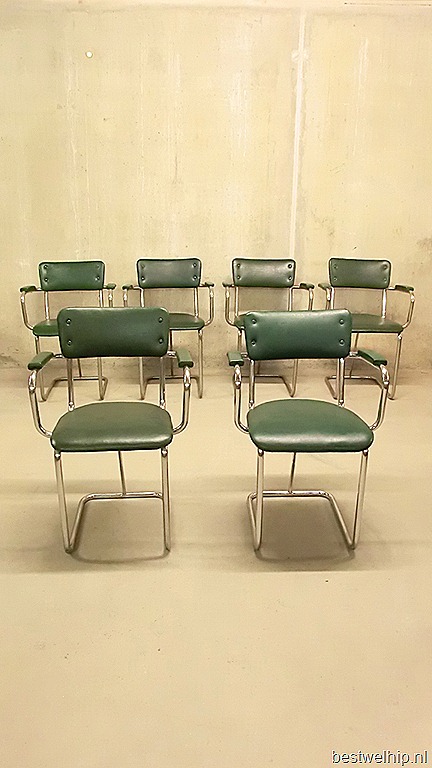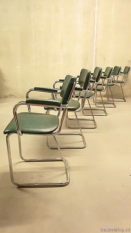Stoere partij originele vintage buisframe stoelen / slede stoelen uit de jaren ‘50 van Ahrend de Cirkel. Deze stoelen hebben een chromen buisframe, skai leren groene bekleding en armleuningen. Afmetingen: H83 x B 55 x D58 cm. Zitdiepte 41 cm, zithoogte 44 cm. Sommige zijn nog voorzien van originele sticker met het logo aan de onderkant. Gezien de leeftijd in goede gebruikte vintage staat, enkele hebben vintage sporen aan het skai maar desondanks stoelen om ‘verliefd’ op te worden. Ze hebben een heerlijke zit. Prachtige partij stoelen met een industriële look, mooi voor aan de eetkamertafel, als wachtkamerstoelen of als bureaustoel. Prijs: verkocht