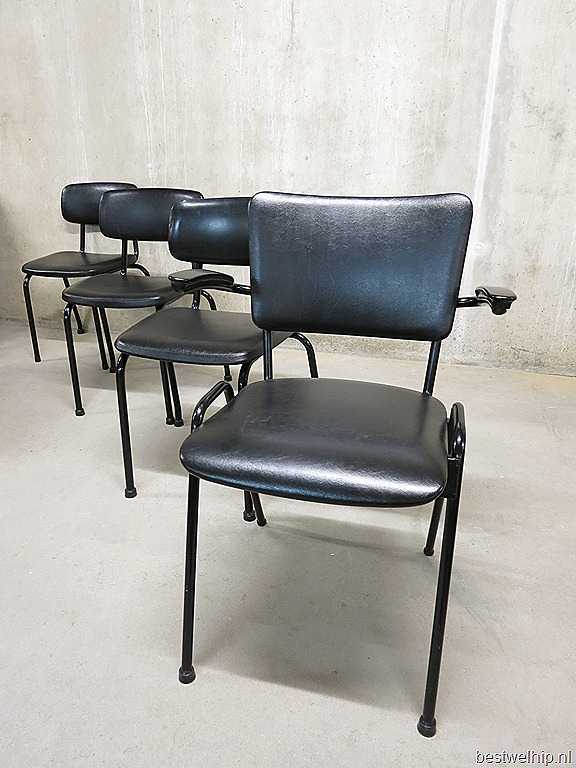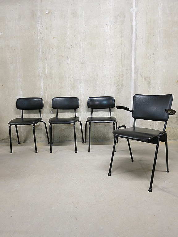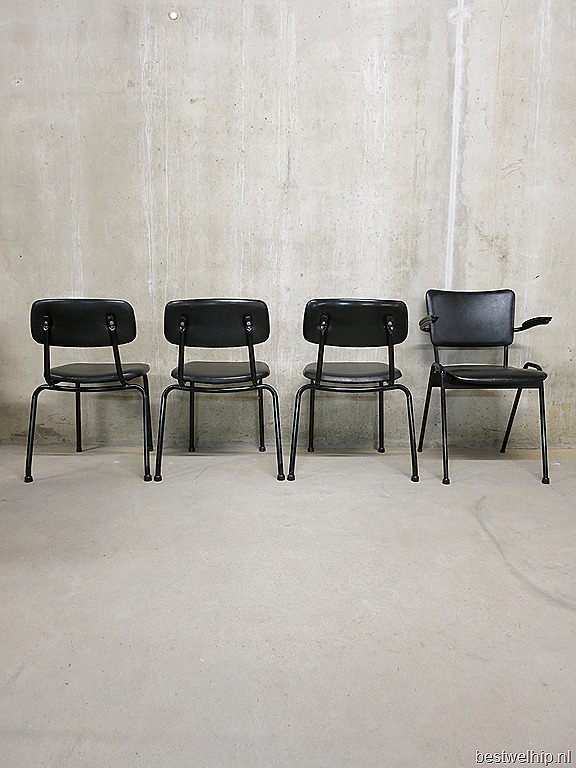 Originele stoelen set met een industriële look geproduceerd door Ahrend de Cirkel in 1964. Onderkant is voorzien van originele merksticker. Materiaal: metalen zwarte buisframe met zwarte skai leren bekleding. Betreft 3 stoelen zonder en 1 stoel met armleuning. Gezien de leeftijd in goede vintage staat (enige vintage sporen aan het skai) Bijzondere strakke vintage design stoelen met een comfortabele zit, prachtig voor aan een lange tafel. Prijs: verkocht