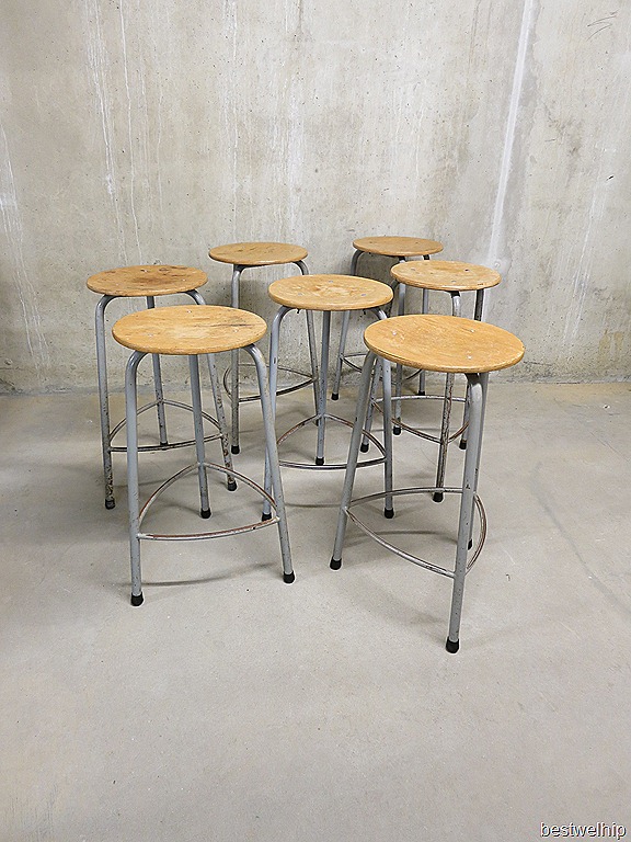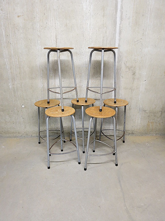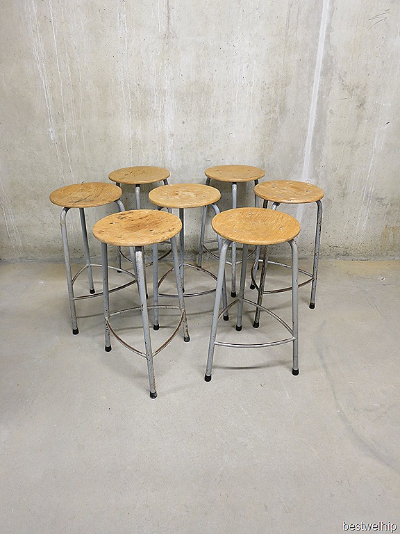 Stoere industriële vintage atelierkrukken (hoog) van Ahrend de Cirkel. Periode: 1962. Ideaal voor in een creatieve ruimte. Of gewoon voor aan een bar/ tafel of tekentafel. Afmetingen: zithoogte 61 cm, breedte 40cm, doorsnede diameter zitting 33 cm. Materiaal: metalen frame/onderstel met driepoot, ring en stoer doorleefde houten zitting. Het doorleefde uiterlijk en de metalen ring aan de onderkant geven dit exemplaar net ‘dat’ beetje extra. Door zijn solide stevige uitvoering absoluut een onverwoestbare kruk. Prijs: verkocht