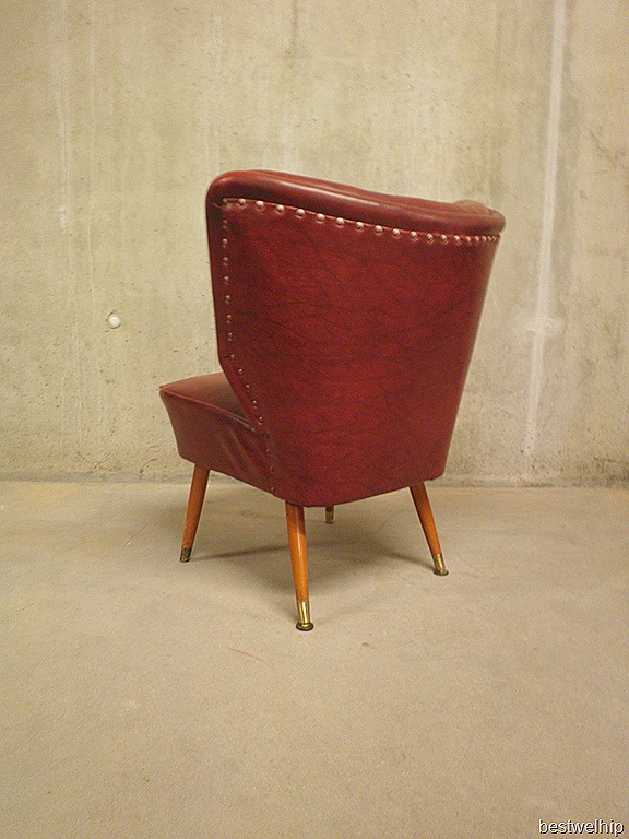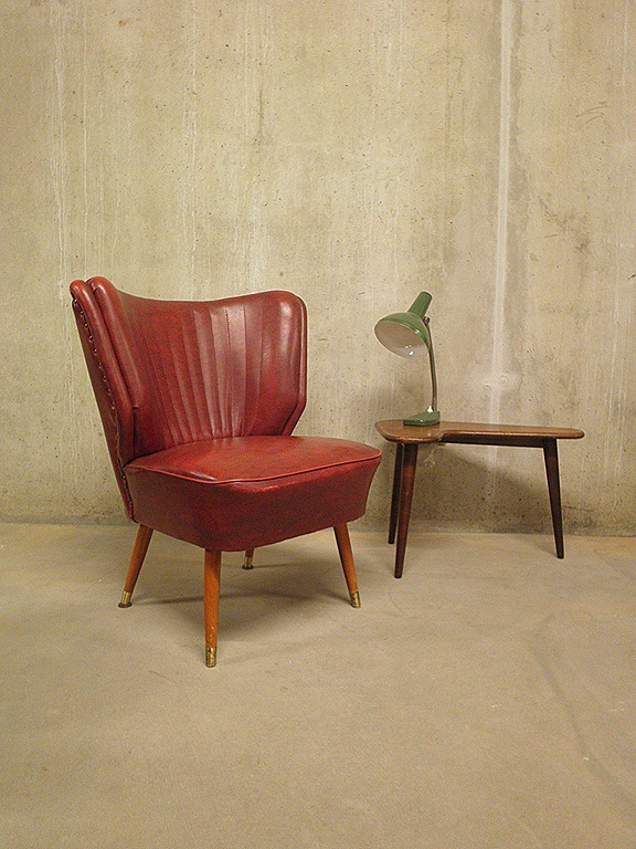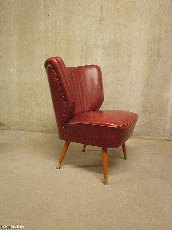 Prachtig vormgegeven cocktail stoel uit de jaren 50. Merk: Artifort. Materiaal: skai leer, houten schuine poten met koperen hulsjes aan de onderzijde. Heerlijke zit! Gezien de leeftijd nog in goede vintage staat ( minuscuul gaatje op zitting, valt minimaal op) Ideaal om bij te zetten in de ruimte, heerlijk zitcomfort. Een klassieker die momenteel weer bestwelhip is. Prijs: verkocht