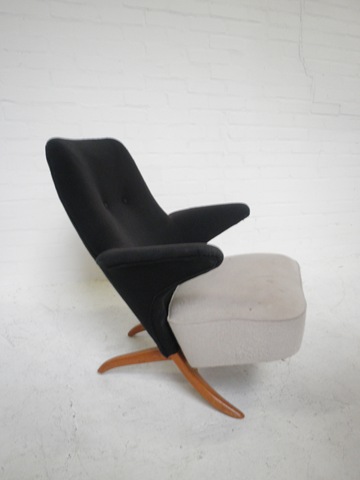 Pinguin…, dat is het eerste wat je denkt bij het zien van deze stoel. Deze stoel is ontworpen door Theo Ruth voor Artifort in 1957. Voor die tijd een absoluut progressief ontwerp (gebaseerd op de Afrikaanse design stoel ) Deze stoel bestaat uit 2 delen, makkelijk uit elkaar te nemen en op te bergen. Afmetigen: H83xB76xD80 cm. De prachtige wollen stof is nog in perfecte staat en stijlvolle houten poten. Deze stoel is gezien zijn leeftijd in goede vintage conditie en zit echt fantastisch. Alleen het zitgedeelte eventueel opnieuw stofferen. Deze comfortabele lounge stoel staat grandioos in een modern design interieur! Een echt collectors item voor de liefhebber.