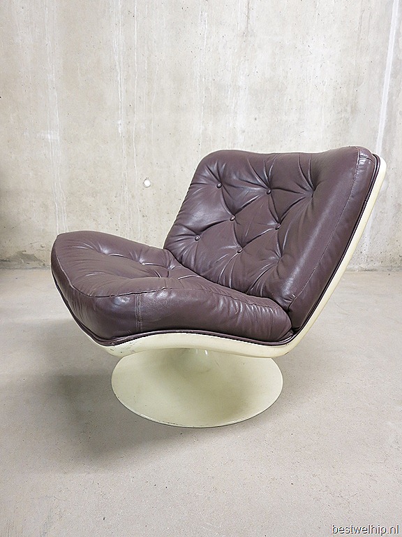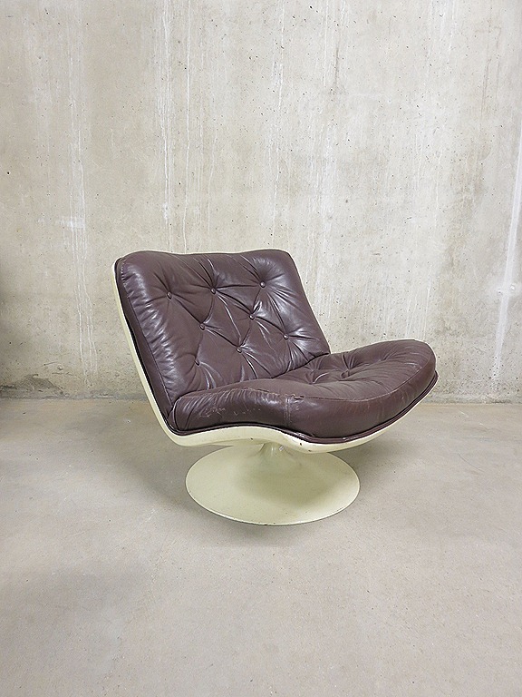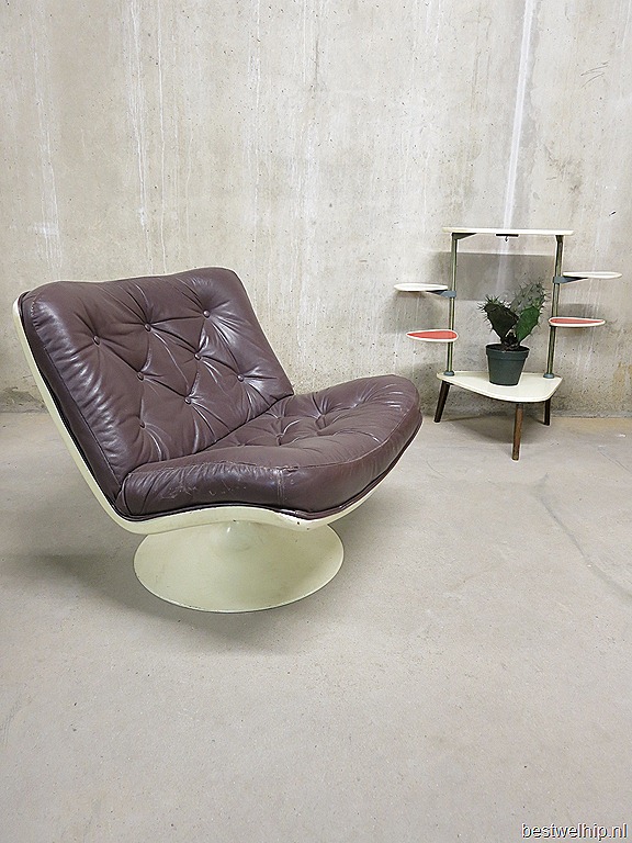 Fantastische stoel ontworpen door Geoffrey Harcourt voor Artifort in 1968. Deze stoel type F976 is origineel uit 1968. De off white polyurethaan schelp met de tulp voet is kenmerkend voor dit model. Het zitcomfort is optimaal met draaibare voet. Een prachtig kleuren contrast tussen het bruine doorleefde leer en de off white kuip. Mooi door zijn eenvoud en stijlvol lijnenspel. Deze stoel is in goed gebruikte vintage staat. Deze stoel heeft enige vintage sporen aan de kuip (achterzijde) en leer maar desalniettemin een zeer mooi en stoer vintage exemplaar. De onderkant is gemerkt. Afmetingen: H65 x B70 x D 70 cm, zithoogte 37 cm. Sinds enkele jaren is deze stoel weer terug in de productie genomen. Toch straalt het vintage exemplaar meer authenticiteit uit. Fantastisch in elke interieur! Prijs: verkocht