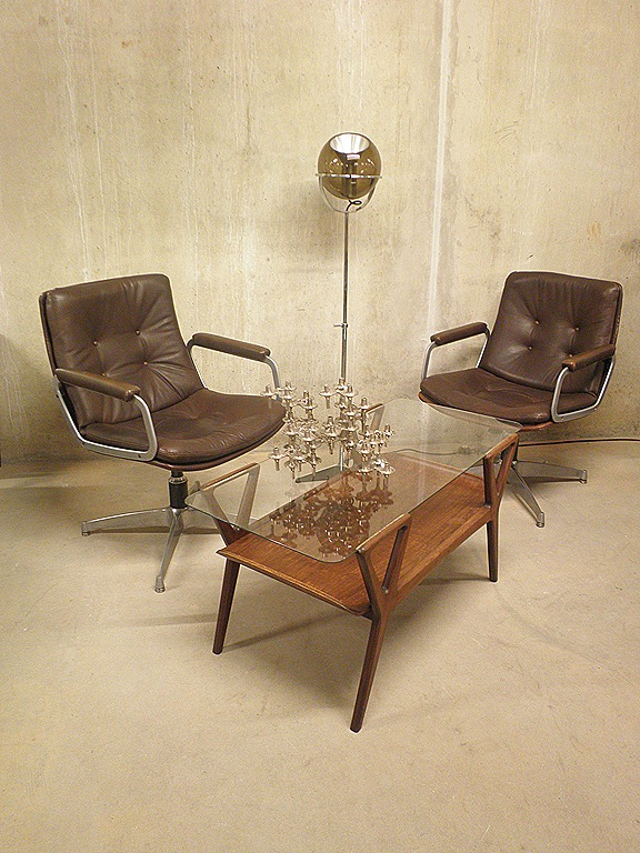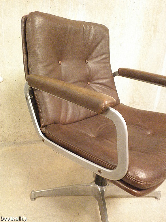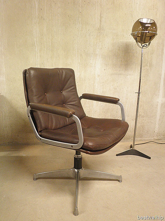 Stoere industriële leren vintage easy chair/ lobby chair. Ontwerper: Geoffrey Harcourt voor Artifort. De naam van de alom bekende meubelfabriek Artifort komt van het latijn art & fortes ( kunst & kracht). Periode: jaren 60. Dit model is bijzonder door zijn kiepmechaniek/ schommelstoel stand waardoor hij een heerlijk zitcomfort heeft. Materiaal: leren bekleding en armleggers, prachtige aluminium stervoet & armleuning, eames stijl. Deze leren variant is maar een beperkte oplage uitgebracht. Zithoogte is: +/- 44 a 45 cm. Nog in goede vintage staat ‘prachtige used look’. Dit vintage exemplaar geeft een gevoel van luxe met een knipoog naar het minimalisme. Prachtig in zowel een modern als vintage interieur. Prijs: verkocht