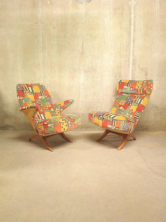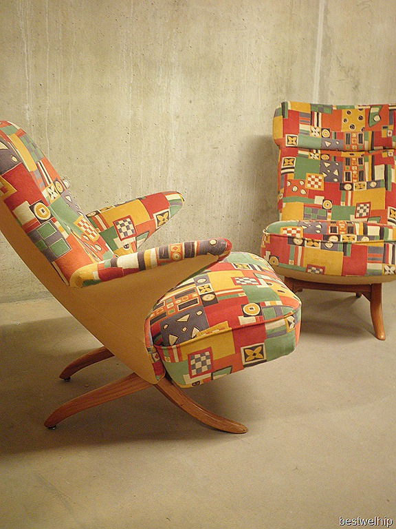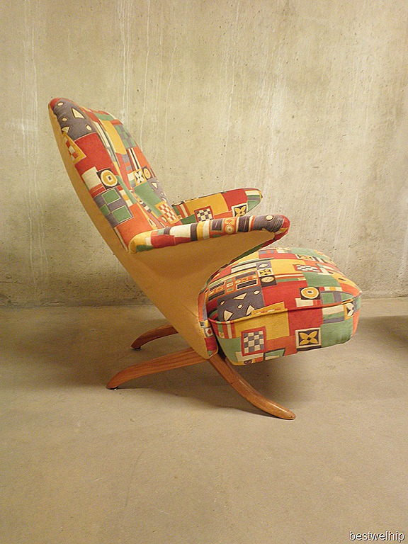 De Congo & de Pinguin stoel van Theo Ruth voor Artifort, een ontwerp uit 1952. Prachtig door zijn eenvoudig ontwerp. Theo Ruth werd beschouwd als de pionier van de ontwerptraditie van Artifort. Hij maakte fabuleuze ontwerpen zoals deze Congo chair & Pinguin chair. Zijn inspiratie is gebaseerd op een Afrikaanse stoel waarbij 2 losse delen in elkaar haken en weer beide los te koppelen zijn. Deze Congo en Pinguin lounge stoel zijn voorzien van nieuw beklede stof in Pop-Art stijl. Stijlvolle vormgeving door zijn mooie houten poten en fantastisch zitcomfort. Deze comfortabele lounge set is zeer bijzonder en staat grandioos in ‘n vintage als modern design interieur, in een hotel lobby of als winkeldecoratie. Absoluut uniek in deze setting. Nog in perfecte staat. Uiteraard ook mooi om te laten bekleden in een stof passend bij je interieur. Absoluut een tijdloos ontwerp. Prijs: verkocht