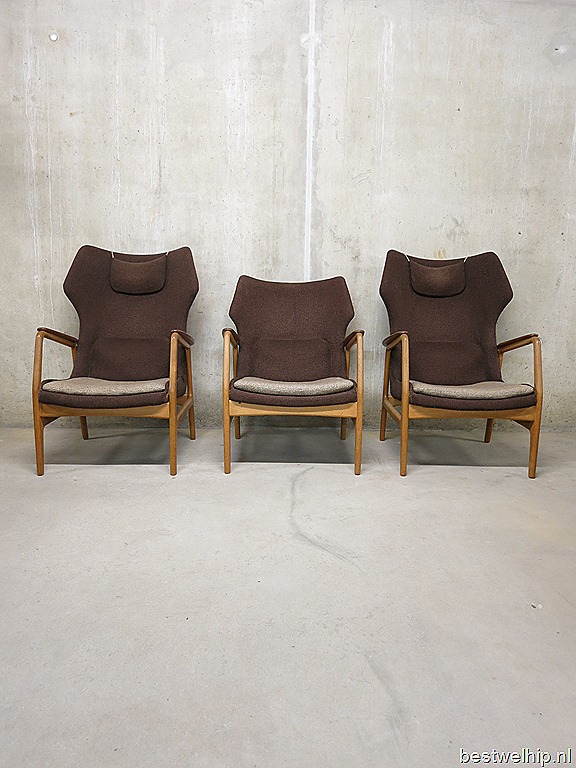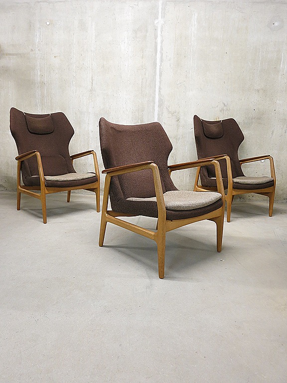 Prachtige design klassiekers van het beroemde Nederlandse merk Bovenkamp, Holland. Periode: jaren 50/60. Het design van deze stoel is geïnspireerd op de Scandinavische vormen. Ook wel de wingback chair genoemd. Bijzonder en kenmerkend aan deze stoel zijn de doorlopende armleggers van massief teakhout. Materiaal: teak houten frame, bruinkleurige bekleding. Bekleed met de originele ploegstof. Afmetingen : herenmodel: H96 x B65 x D80cm, zithoogte 38 cm, zitdiepte 42 cm. Damesmodel: H83 x B65 x D73cm, zithoogte 38 cm, zitdiepte 42 cm. Gezien de leeftijd nog in goede gebruikte vintage staat. Een bijzondere design klassieker met oog voor details. Prachtig in zowel een vintage als een modern interieur! Prijs: verkocht