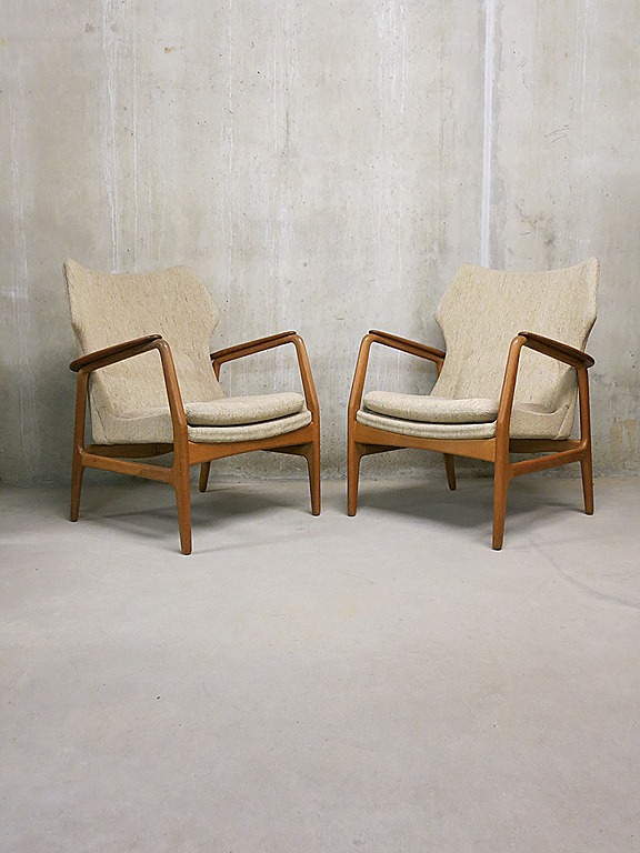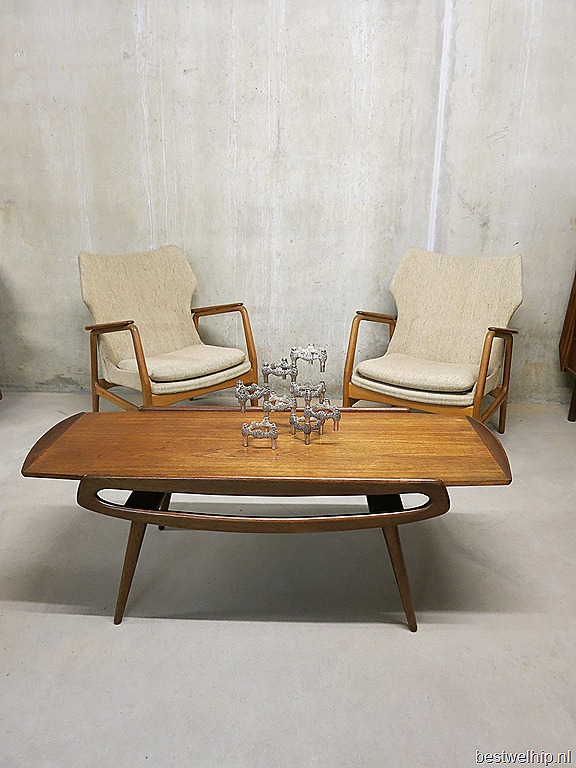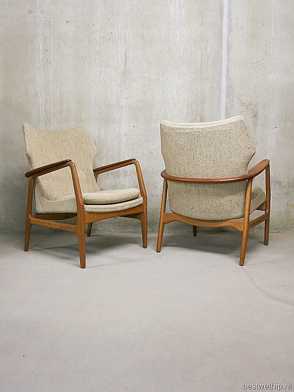 Prachtige design klassiekers van het beroemde Nederlandse merk Bovenkamp, Holland. Periode: jaren 50/60. De onderkant is gemerkt met een originele Bovenkamp stempel. Het design van deze stoel is geïnspireerd op de Scandinavische vormen. Ook wel de wingback chair genoemd. Bijzonder en kenmerkend aan deze stoel zijn de doorlopende armleggers van massief teakhout. Materiaal: teak houten frame, ecru kleurige bekleding. Bekleed met de originele ploegstof. Afmetingen: H0.86 x B0.65 x D0.71 cm, zithoogte 0.42cm. Gezien de leeftijd nog in zeer goede originele vintage staat. Een bijzondere design klassieker met oog voor details. Prachtig in zowel een vintage als een modern interieur! Prijs: verkocht