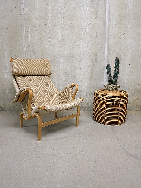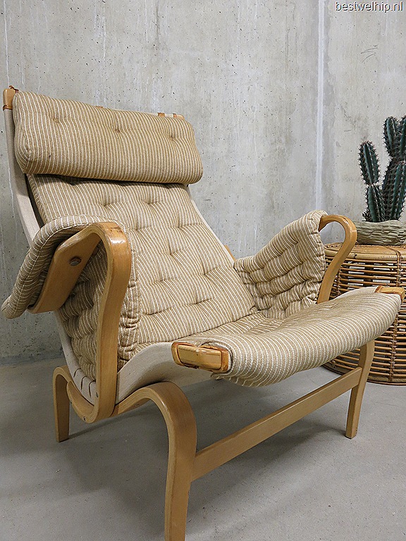 Prachtig gestroomlijnd deze unieke en bijzonder in het oog springende Scandinavische fauteuil. Ook wel de Pernilla chair genoemd .Een mooi ontwerp van Bruno Mathsson. Producent: Dux. Land van herkomst: Zweden. Periode: jaren 50. Materiaal: plywood in berken kleur met stoffen bekleding en canvas rug, de hoofdsteun is bevestigd met leren lussen. Afmetingen: H97 x B82 cm, zithoogte 39 cm, zitdiepte 49 cm. Gezien de leeftijd nog in goede vintage staat. Deze stoel heeft een zeer comfortabele zit.
