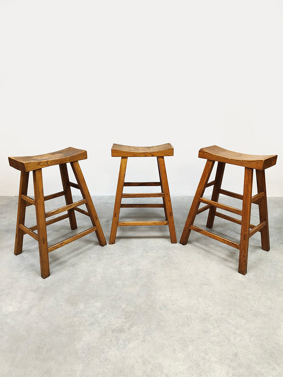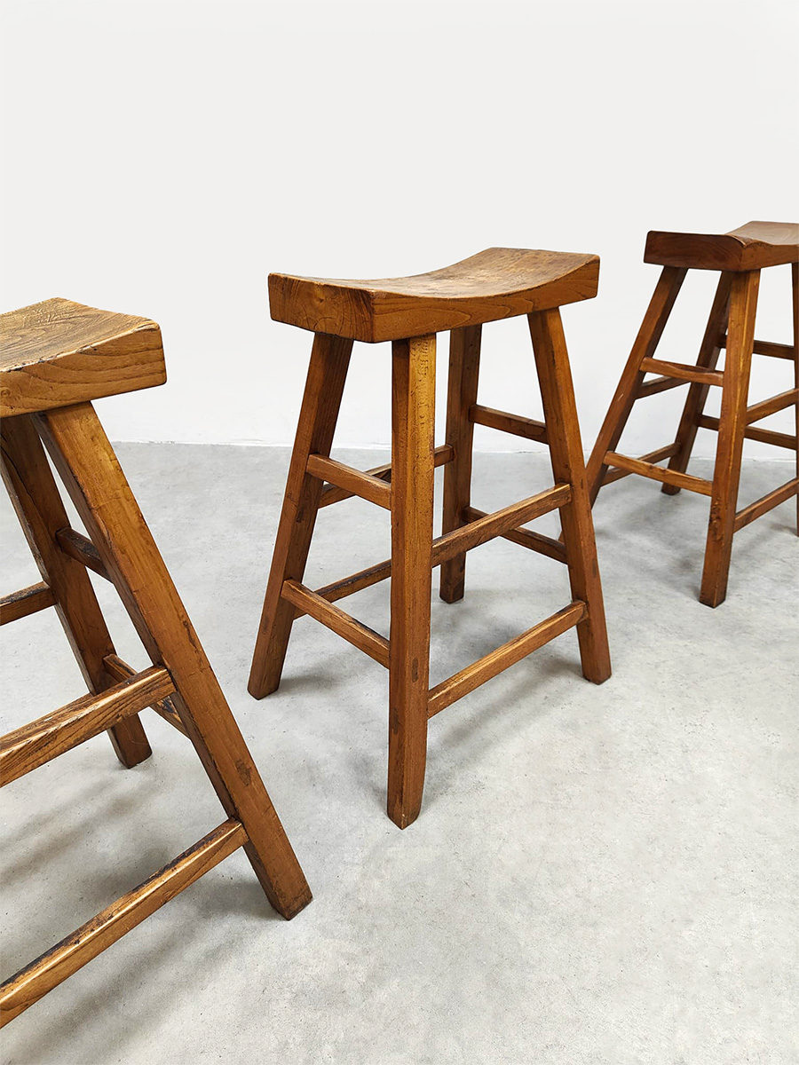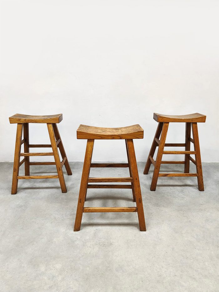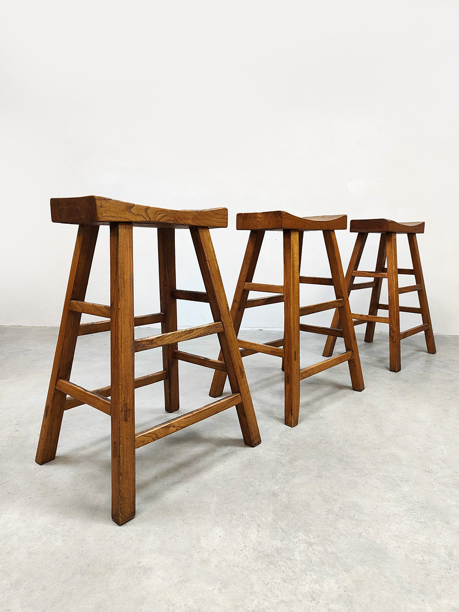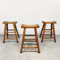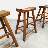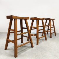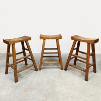 Mooi door zijn eenvoud maar toch net ff anders dan anders! Land van herkomst: Frankrijk. Periode: 1970. Deze houten krukken in ‘Shaker stijl’ passen perfect in de Wabi Sabi woonstijl van nu. De massieve uitstraling geeft direct een eigen karakter aan je interieur. De licht uitlopende poten en de ‘wooden curved’ look zorgen voor een uniek en sculpturaal geheel. Gezien de leeftijd nog in een goede vintage staat. Deze vintage barkrukken zijn perfect aan een keukeneiland of hoge bartafel.