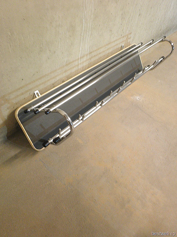 Bijzonder chromen buizen kapstok in Gispen stijl. Jaren 60/70. Lengte is 90 cm. De kapstok bevat 13 ophanghaken en 3 bovenliggers voor hoeden en sjaals. Materiaal: chromen buizen frame met een prachtige antraciet kleurige vinyl achterkant. Nog in zeer goede vintage staat. Deze kapstok is optisch erg stijlvol en staat prachtig in elk interieur. Hangt deze straks mooi bij jou in de hal? Prijs: verkocht