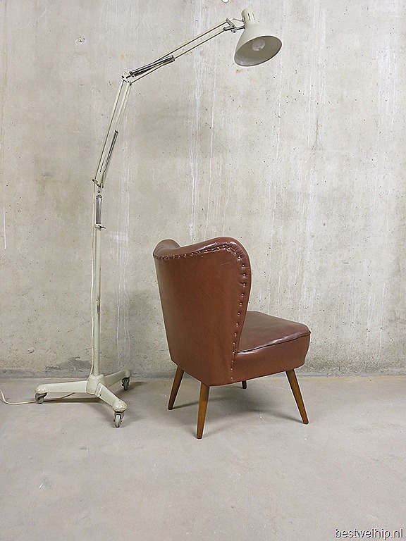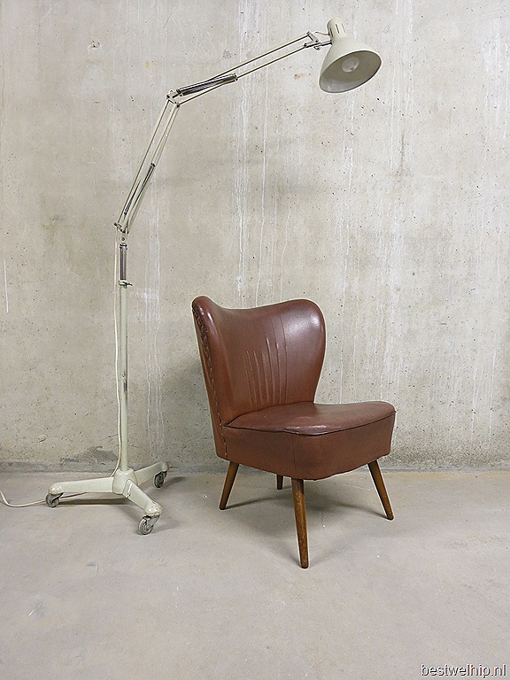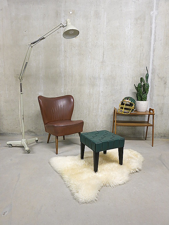 Stoere cocktail stoel uit de jaren 50. Materiaal: bruin skai leer met zwarte bies, houten schuine poten. Ideaal om bij te zetten in de ruimte, heerlijk zitcomfort. Een klassieker die momenteel absoluut weer bestwelhip is. Een tijdloos exemplaar door zijn strakke minimalistische vormen, met oog voor detail. Doordat deze fauteuil een lage rug heeft, oogt hij ruimtelijk in zijn omgeving. Gezien de leeftijd nog in redelijk goede vintage staat ( aan de achterkant bovenzijde rug enige vintage sporen/ kleine plekjes ) maar desalniettemin een erg leuk exemplaar. Mooi voor thuis in het interieur maar ook voor in een lounge bar of café/cocktail bar. Prijs: verkocht