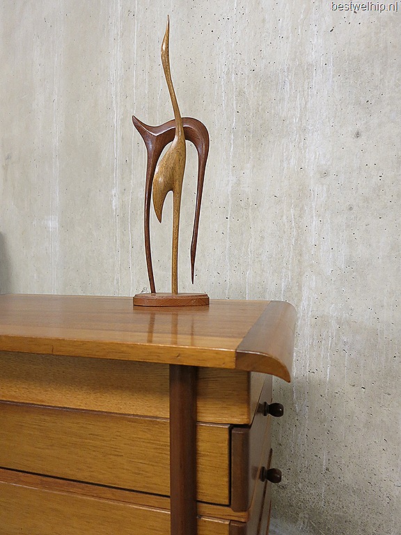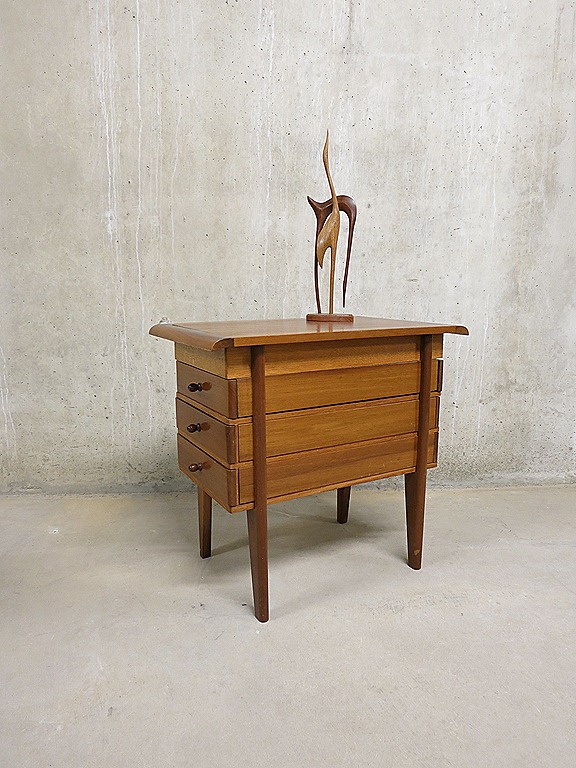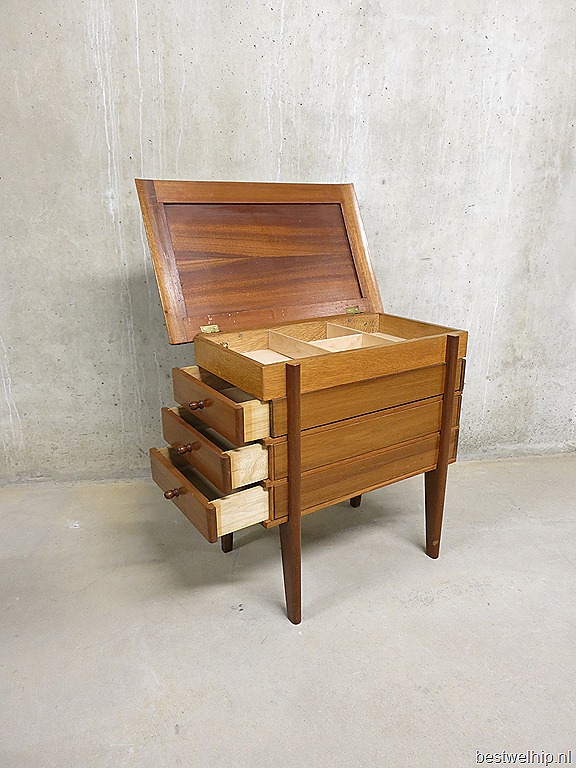Prachtig vormgegeven en zeldzaam vintage Deens design kastje. Materiaal: 2 kleurig teak hout. Land van herkomst: Denemarken. Merk: onbekend. Periode: jaren 50/ 60. Zeer mooi exemplaar door zijn strakke lijnen & bijzondere ronding aan de bovenkant van het blad. Ook nog eens erg praktisch door de 3 lades aan beide zijkanten en de klep aan de bovenkant. Ideaal om je tijdschriften en afstand bieding in op te bergen. Afmetingen: B60 x D37x H57 cm. Gezien de leeftijd nog in goede vintage staat ( enkel 1 knopje aan de zijkant ontbreekt) Prachtig in de woonkamer als side table/ bijzettafel. Uiteraard ook gewoon leuk voor aan de wand met een vaas of kandelaar erop. Prijs: verkocht