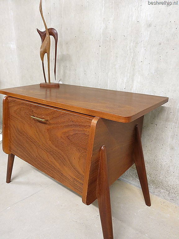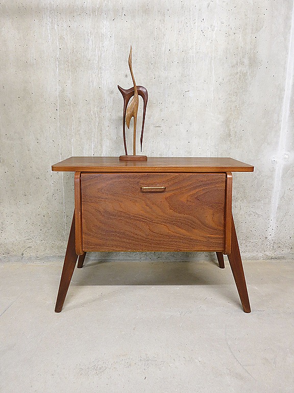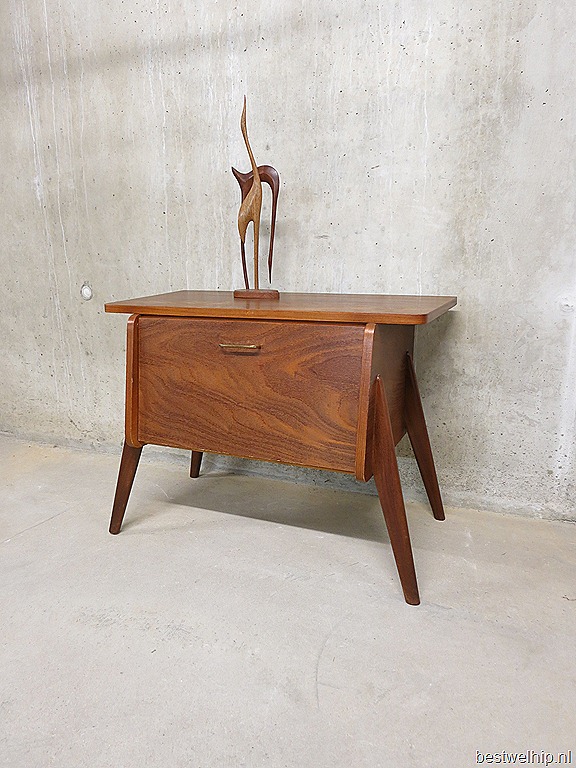Dit wandmeubel in Deens/Scandinavische stijl is prachtig door zijn vormgeving details en bescheiden afmetingen. Prachtig voor in de living of hal. Periode: jaren 60. Merk: onbekend. Materiaal: palissander hout. Land van herkomst: Denemarken. Zeer mooi exemplaar door zijn strakke lijnen, schuine taps toelopende poten & bijzondere houttekening. Aan de achterkant is een uitsparing gemaakt voor kabels. Voorzien van een klep met goudkleurig metalen handgreep. Afmetingen: B71 x D42 x H54 cm. Gezien de leeftijd nog in goede vintage staat. Prachtig in de woonkamer om je tv op te zetten of je muziek installatie in op te bergen. Uiteraard ook gewoon leuk voor aan de wand met een vaas of kandelaar. Prijs: verkocht