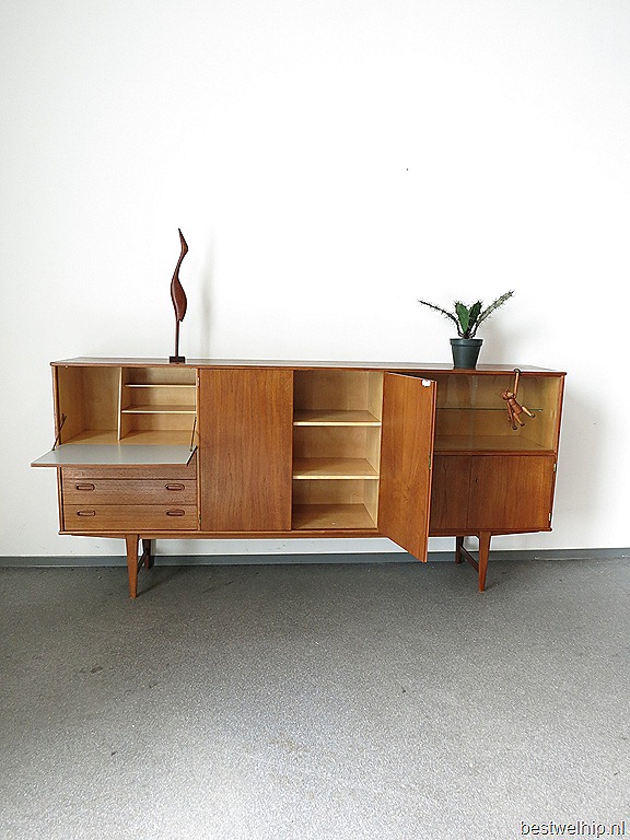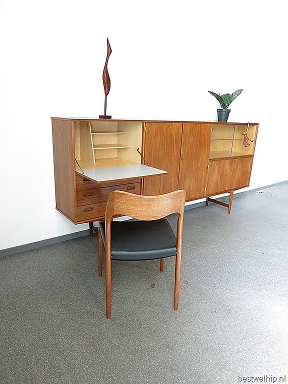 Indrukwekkende vintage design wandkast en secretaire in 1, in Deense stijl. Periode: jaren 60. Materiaal: teak hout, met een mooie hout tekening. Het onderstel, evenals de mooie ovale handgrepen zijn gemaakt van massief hout. De smalle lange slanke lijn van deze vintage wandkast maakt deze net even anders dan al die andere dressoirs. Voorzien van 3 laden, klep met bureau gedeelte, opbergkast met 2 deuren in het midden, rechts glazen vitrine met hieronder nog 2 deuren met daarachter legplanken. Mooie strakke poten. Afmetingen: B2.40 x D0.43 x H1.13. Gezien de leeftijd in goede vintage staat. Dit mooie houten wandmeubel straalt warmte uit en staat prachtig in zowel een modern als in een vintage interieur. Prijs: verkocht