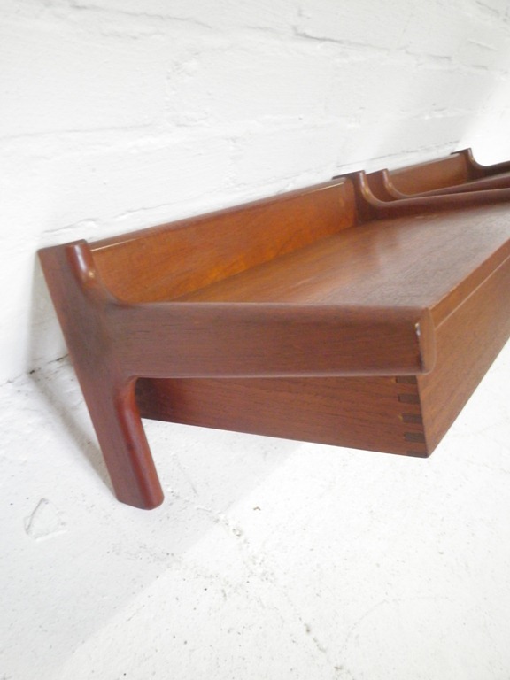 2 prachtige ‘zwevende’ nachtkastjes, Deens design van Dyrlund. De achterkant is voorzien van het Dyrlund label. Voorzien van een schuiflade. Periode: 1960. Materiaal: teakhout. Afmetingen: B49 x D28 x H22 cm. Ook prachtig om ze boven elkaar te hangen als ´zwevende´ boekenplank. In zeer goede vintage staat. Een zeer stijlvolle, aparte en bovenal zeldzame set! Prijs: verkocht