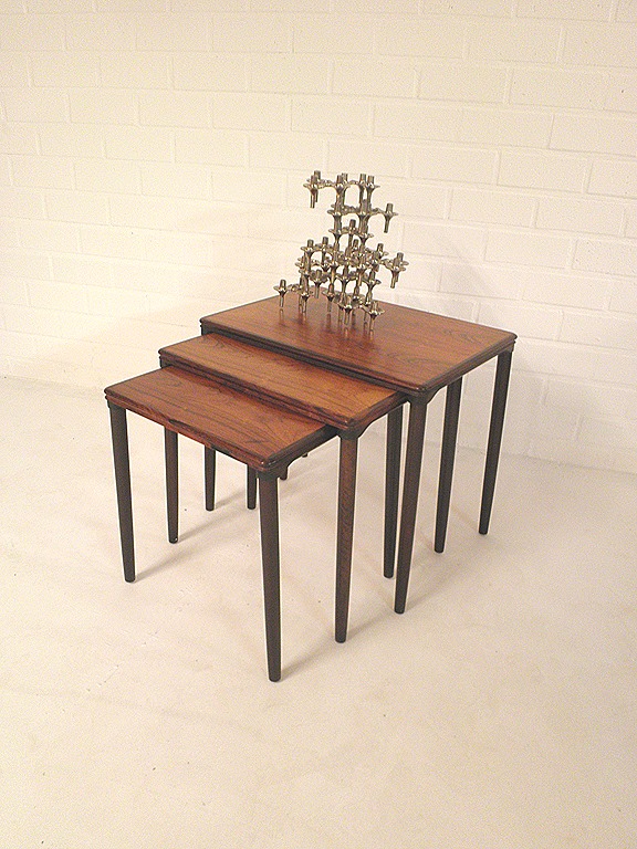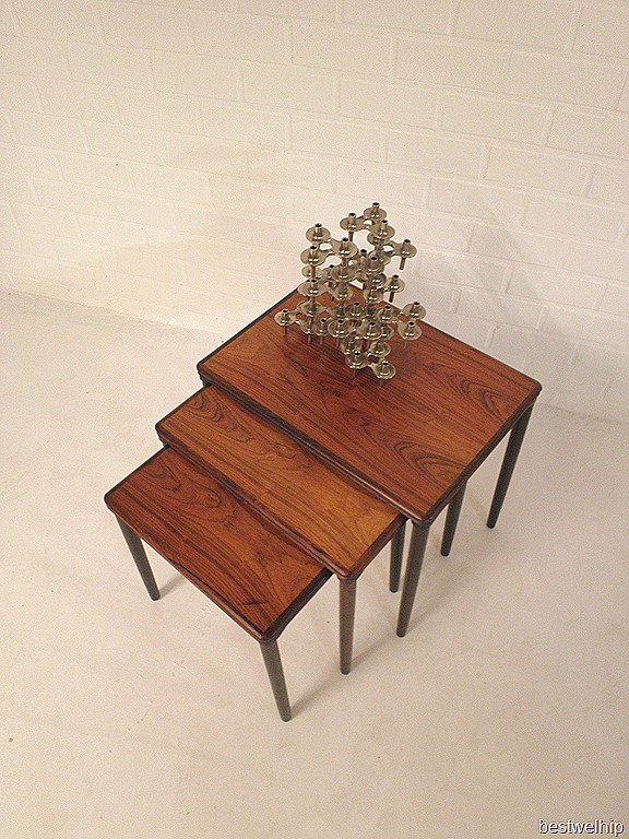 Prachtige Deense vintage design ‘nesting tables’, bijzettafeltjes. De ontwerper is onbekend. Waarschijnlijk Bramin vanwege het uitschuifbare mechanisme. Deze vintage bijzettafeltjes hangen namelijk in elkaar. Periode: jaren 50. Onderkant is gestempeld met de tekst: Made in Denmark. Materiaal: Palissander hout. Gewoon super mooi door zijn mooie vormgeving en door zijn afgewerkte details/ rondingen aan de zijkant van het blad. Nog in zeer zeer goede vintage staat. Is jouw oog gevallen op deze set? Zeer mooi in een vintage als modern interieur. Prijs: verkocht