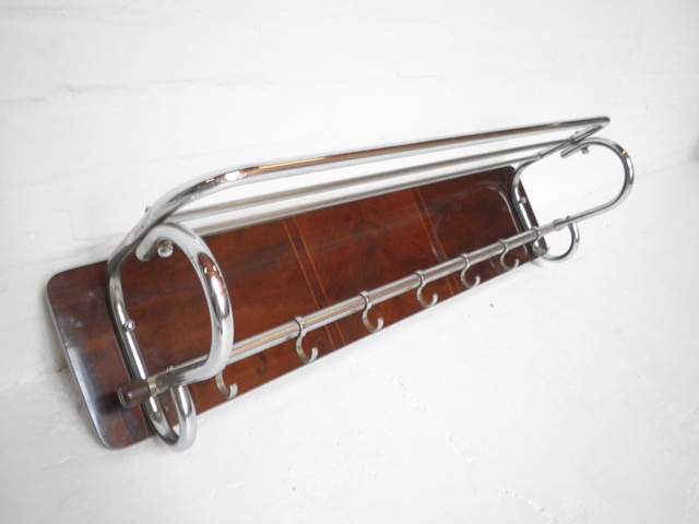 Zeer speciale chromen buizen kapstok, met zeldzame notenhouten achterkant in glanzend houtstructuur. Periode: 1960, Gispen stijl. Deze kapstok heeft 3 boven liggers en 6 ophangpunten. Afmetingen: L90 x H20 x D26 cm. Deze kapstok is stijlvol, tijdloos en een blikvanger in het interieur! In zeer goede vintage staat.