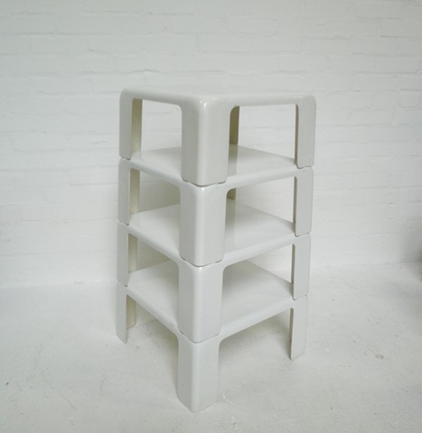 De complete toren van “Quatro Gatti” samengesteld uit 4 witte stapel tafels oftewel ‘nesting tables’ genoemd. Ontworpen door Mario Bellini in 1966 voor B&B Italia. Elke tafel is aan de onderkant genummerd (1 t/m 4) & gemerkt. Afmetingen: hoogte 25 cm, B50 x D50 en dan aflopen met 2 cm. Materiaal: wit Fiberlite kunststof. Stapelbaar, ook mooi om neer te zetten als vierkante ‘kubus’. Zeer uniek omdat deze set nog compleet is. De 3 onderste tafeltjes zijn nog in perfecte vintage staat, het bovenste tafeltje is minimaal/iets vergeeld. Absoluut een must have voor de collector!