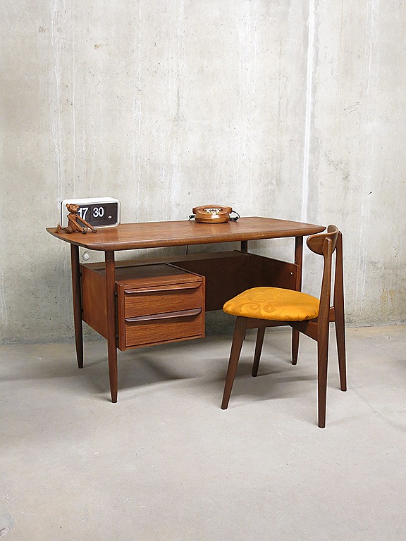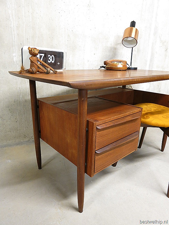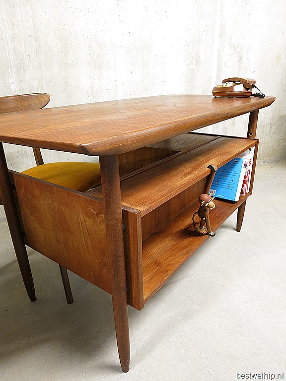 Dit bijzonder vintage Deens vormgegeven design bureau mag je gewoon niet missen. Ontwerper: Tijsseling Dutch design. Model: cow horn desk. Fabrikant: Propos Humefa, Nijkerk Holland. Periode: 1960. Materiaal: hoogwaardig teak. Mooie organische vormen met prachtige handgrepen. De achterzijde is voorzien van een ‘boekenwand’. Mooi door zijn eenvoud. Afmetingen: B1.30 x H0.73 x D0.65 cm.Gezien de leeftijd nog in zeer goede vintage staat. Geef je huis een persoonlijke sfeer met dit prachtig Dutch design bureau. Prijs: verkocht