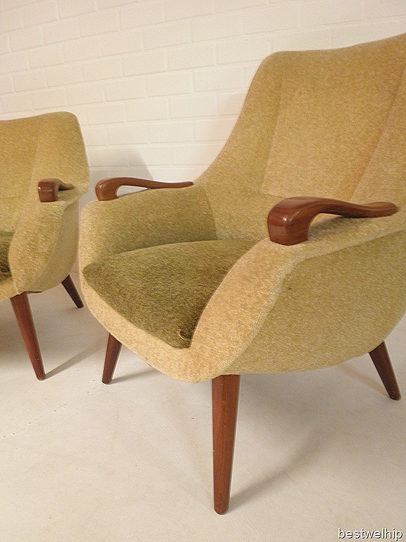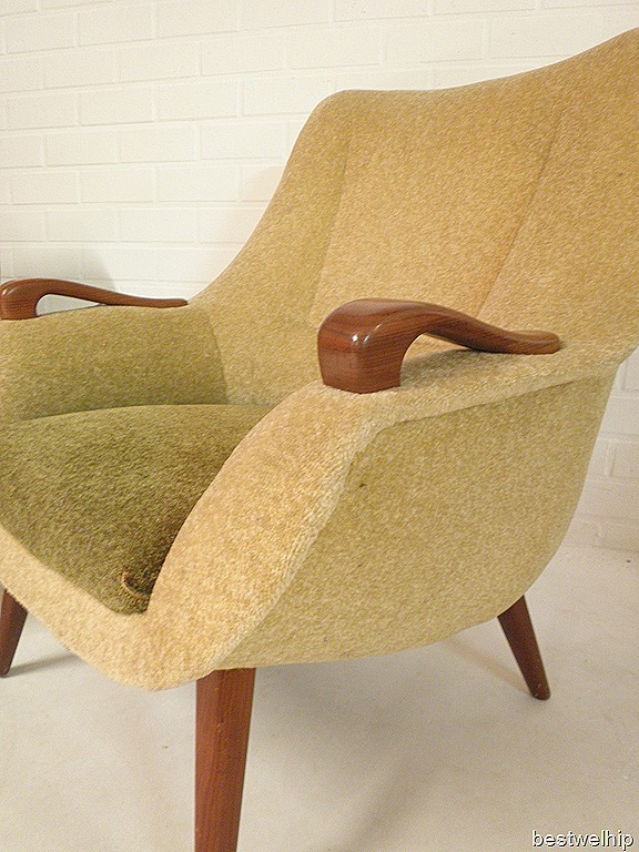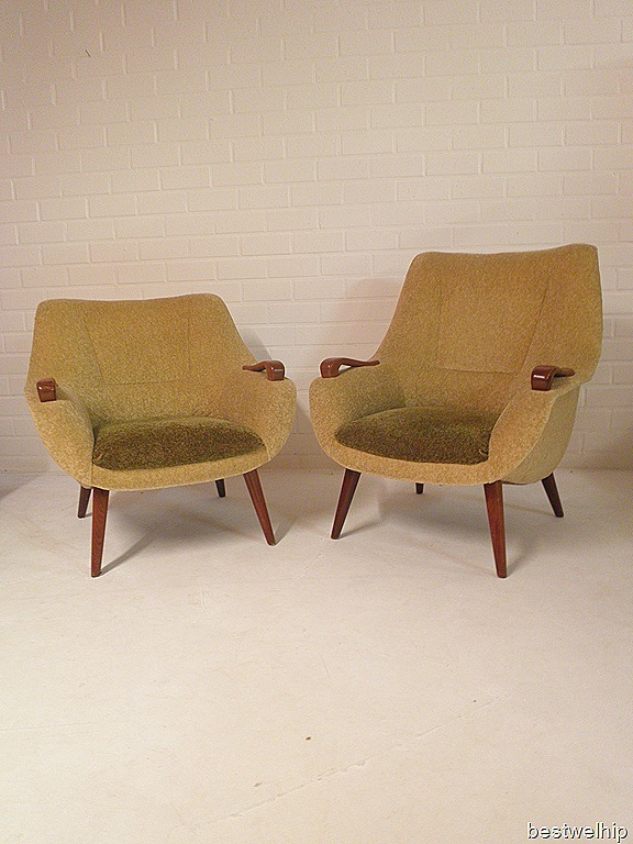 Twee prachtige dutch design lounge fauteuils/ club fauteuils. Bijzonder omdat het een mannetjes & vrouwtjes fauteuil betreft. Periode : jaren 50. Prachtige vormgeving met zeer aparte armleuningen ( Deense stijl) Prachtige soft tone in ecru in combinatie met licht groen. Nog in zeer goede vintage staat. Ideaal om neer te zetten in de living of lounge bar. Prijs: verkocht