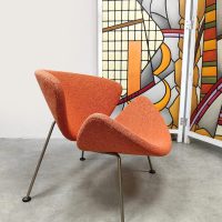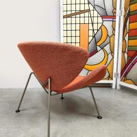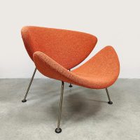 Dutch design classic! Dit design icoon is ontworpen door Pierre Paulin voor Artifort. Afkomstig uit Nederland. Door zijn speelse vormgeving lijkt de stoel er vanuit elke hoek anders uit te zien. Toch bestaat hij uit twee identieke schelp vormen van geperst beukenhout, afgedekt met vormschuim ‘the slices’. Nog voorzien van de originele stoffering in een frisse oranje tint. Ben jij op zoek naar een te gekke fauteuil met een speels karakter? Dan is de Orange Slice wellicht wat je zoekt. Take a seat and relax.