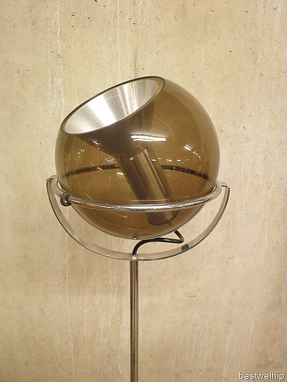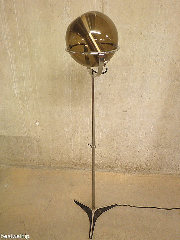 Prachtige vintage design vloerlamp/ floor light van het Nederlandse merk Raak Amsterdam. Periode: jaren 60. Een ontwerp van Frank Ligtelijn, de vloervariant van de Globe 2000 serie. Deze lamp heeft een mooie lichte rookglazen bol, verchroomde metalen standaard/ statief, aluminium reflector aan de binnenkant. De lamp is in hoogte verstelbaar: 1.25 tot 1.75 cm, diameter bol lamp ongeveer 25 cm. Voor direct of indirect licht kan de lamp in verschillende richting draaien. Nog in zeer goede vintage staat. Deze industriële vloerlamp is zeer sfeervol en prachtig in zowel een modern- als vintage interieur. Prijs: verkocht