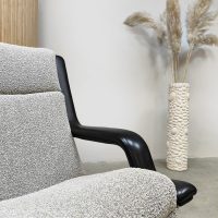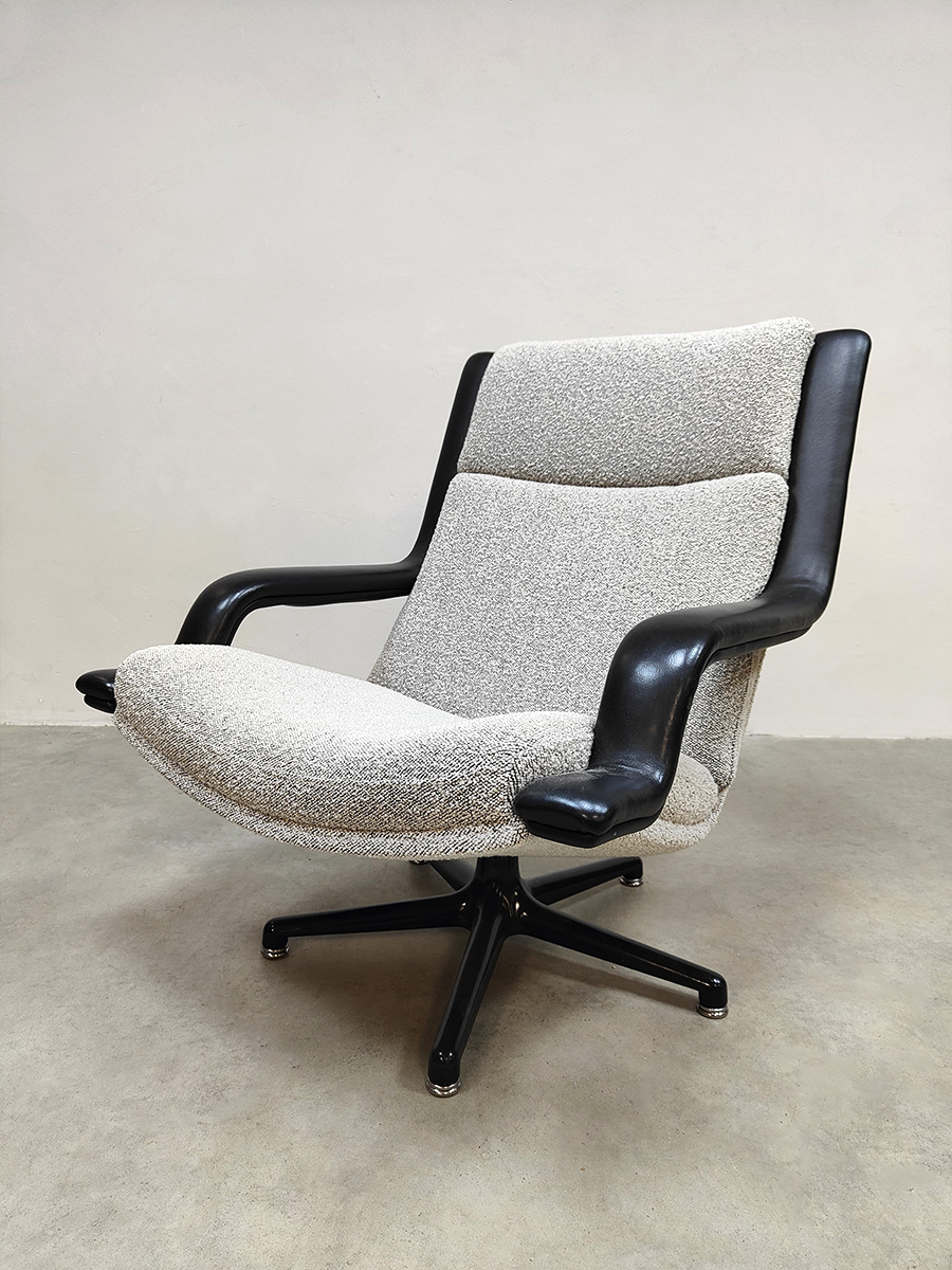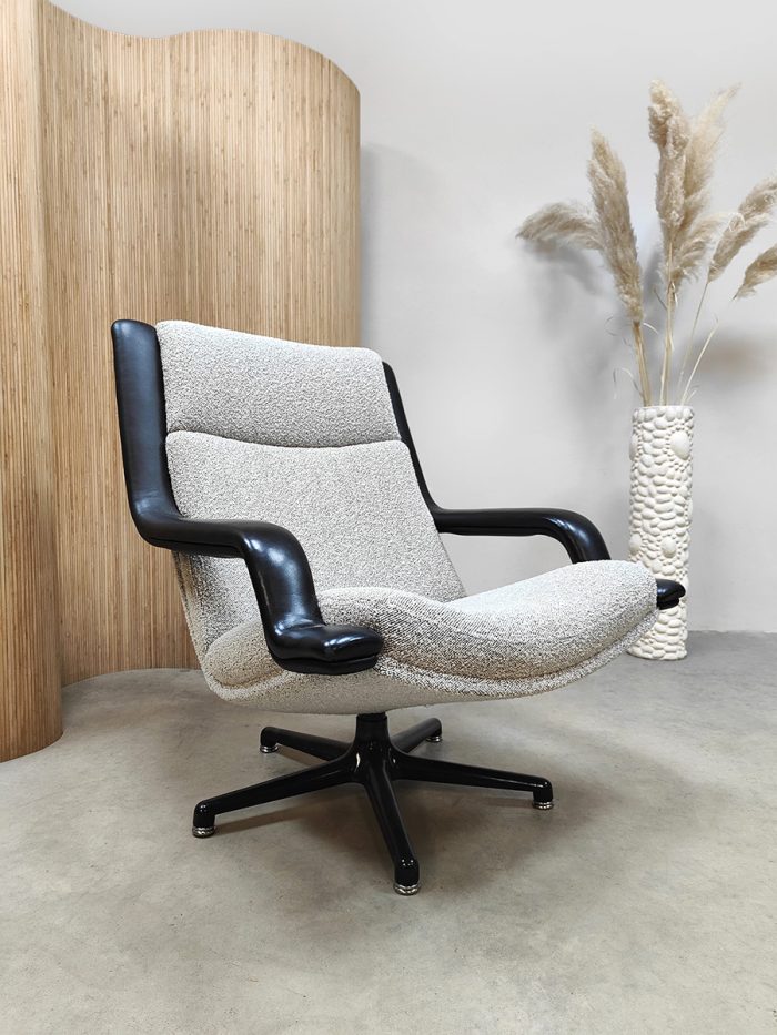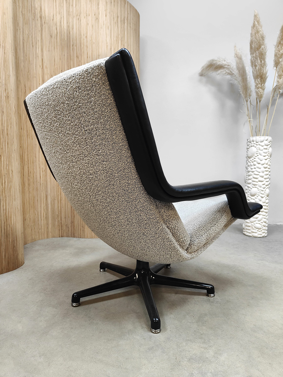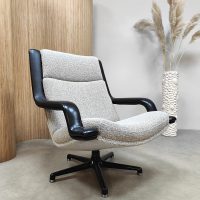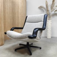 Artifort lovers opgelet, deze tijdloze & stijlvolle draaifauteuil is een lust voor het oog . Een ontwerp van Geoffrey Harcourt voor Artifort uit de jaren 60-70. Model : F140. Artifort staat bekend om zijn goede zitcomfort, luxe en tijdloze vormgeving. Dit is absoluut terug te zien in deze prachtige swivel chair. Dit model is voorzien van een strakke draaibare zwart metalen stervoet. Deze fauteuil is voorzien van Ploeg stof & leren armleuningen. Gezien de leeftijd nog in een zeer goede staat. Mooi om bij te zetten in je living naast de bank. Een prachtige fauteuil voor zowel in een modern als vintage interieur. Take a seat and relax!
