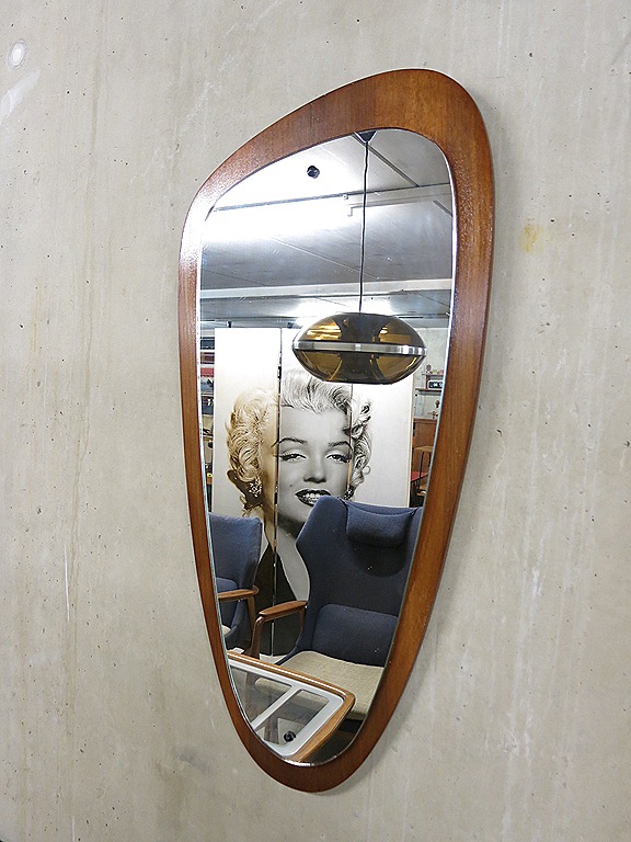 Door zijn bijzondere ovale vormgeving en strakke hout kleurige lijst zeer stijlvol en decoratief. Dit vintage design spiegel is kenmerkend voor de jaren 60. Ontwerper: onbekend. Afmetingen: hoogte 0.78 cm, breedte bovenkant 0.38, onderkant 0.22 cm, diepte 2,5 cm. Gezien de leeftijd nog in goede vintage staat. Prachtig in elk interieur, voor in een hal of kamer. Prijs: verkocht