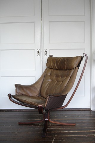 Originele fauteuil model Falcon chair, ontworpen door Sigurd Ressel (Norway) voor Vatne Mobler in de jaren ‘70. Het frame is vervaardigd van gebogen hout, zitting is van bruin leer. Een los bruin leder kussen op canvas hangend in een plywood houten frame. Onderkant van de stoel is gemerkt. AfmetingenL H 1.00 x B 78 cm. De zithoogte is 42 cm. Zeer prettig zitcomfort. Gezien de leeftijd nog in goede vintage staat.