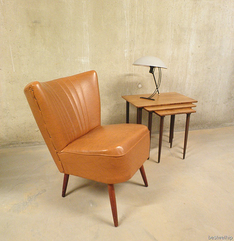 Hippe cocktail chair uit de fifties in een warme camel kleur. Stijlvol, elegant en ze zitten heerlijk (nog zeer goede vering) Periode: fifties. Materiaal: skai leren bekleding, houten poten. Afmetingen: B63 x D74 x H 70 cm, zithoogte 43 cm, zitdiepte 41 cm. Deze club fauteuil is gezien zijn leeftijd in goede vintage conditie met minimale gebruikerssporen ( in het hoekje rechts een kleine opening) Prijs: verkocht