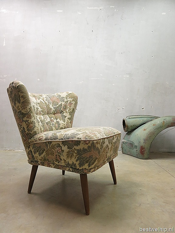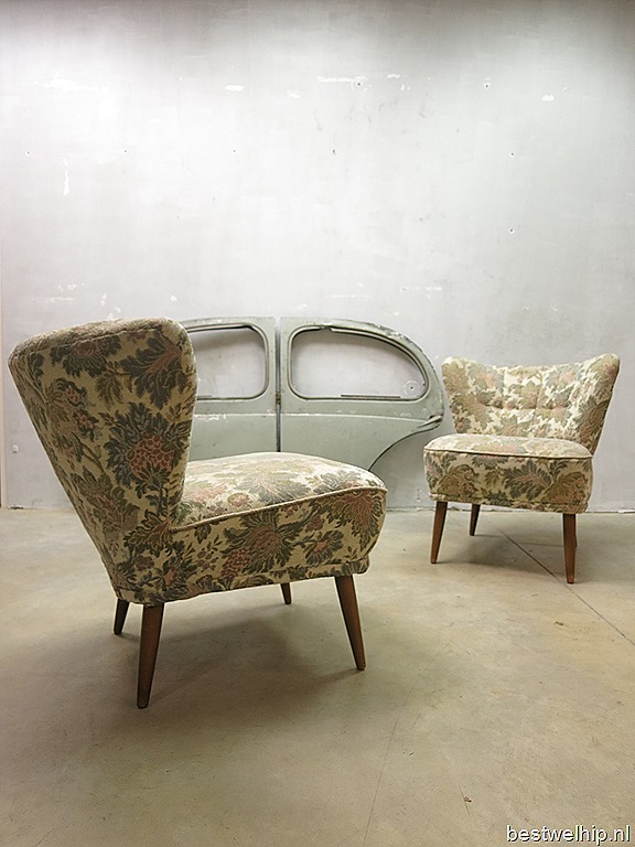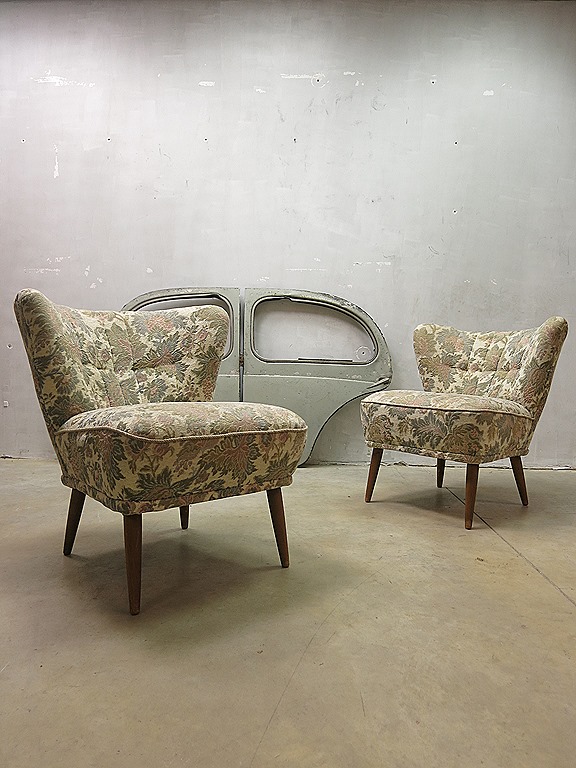 Twee mooie vintage design lounge fauteuils/ club fauteuils/ armchairs in pastel kleuren. Periode : jaren 50. Ontwerper onbekend, waarschijnlijk van Artifort. Bijzonder ‘lief’ in dit mooie blad/bloem motief. Deze cocktail stoelen hebben een heerlijke comfortabele zit met een perfecte binnen vering. Gezien de leeftijd nog in goede vintage staat. Deze stoelen zijn zeer apart door de excentrieke print. Absoluut een eye-catcher in je interieur. Mooi voor thuis maar ook prachtig als lounge hoek in een bar/ café, restaurant of lobby van een hotel. Prijs: verkocht