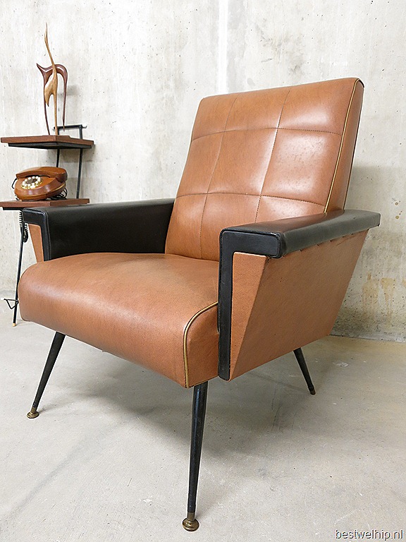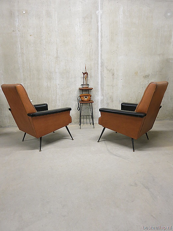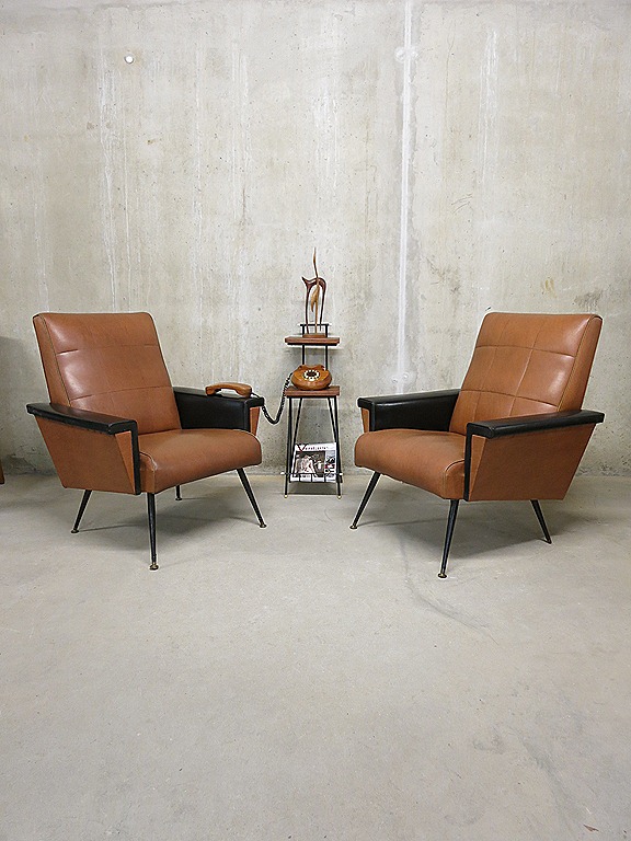 Helemaal uit Frankrijk komen deze 2 prachtige skai leren lounge fauteuils in ‘rock a billy’ stijl. Periode: jaren 50. Materiaal: bruin met zwart skai leer, metalen cocktail poten. Gezien de leeftijd nog in goede vintage staat. Absoluut een eye-catcher in je interieur. Mooi voor thuis maar ook prachtig als lounge hoek in een café, restaurant of lobby van een hotel. Prijs: verkocht