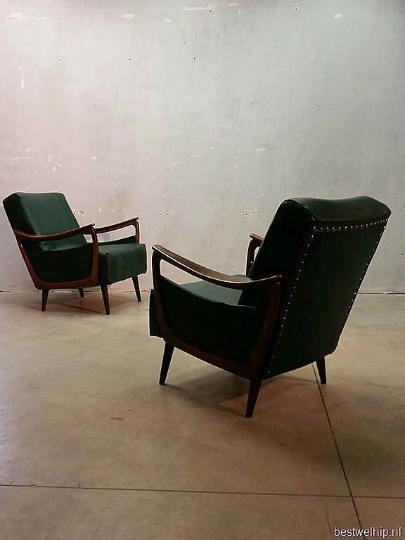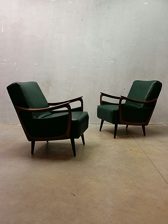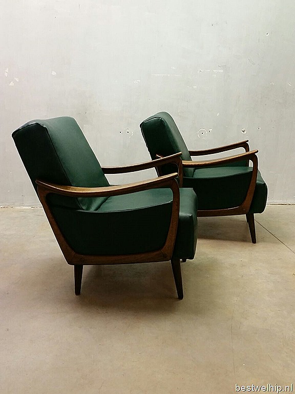 Twee stoere Dutch design lounge fauteuils met prachtige houten armleuningen in Deense stijl. Periode: jaren 50. Nog voorzien van origineel groen skai leer. Gezien de leeftijd in goed gebruikte vintage staat. Uiteraard ook mooi om in ‘n stof te laten stofferen passend in uw interieur. De bijzondere houten armleuningen maken deze stoel net even anders dan anders. Mooi om neer te zetten in de living of in ‘n lounge hoek van een café, restaurant of winkel. Prijs: verkocht