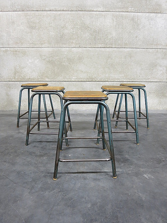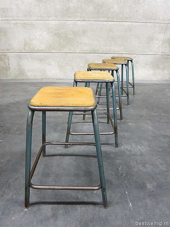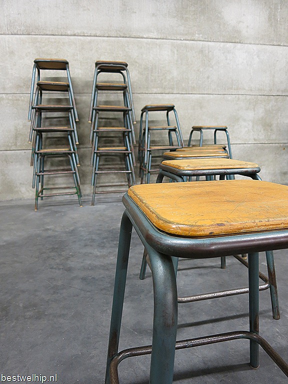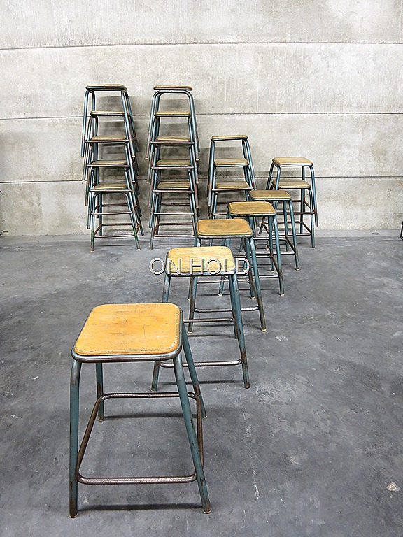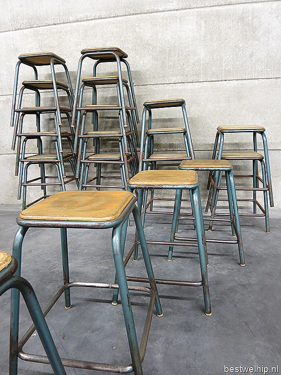 Stoere partij industriële Franse vintage krukken. Periode: jaren 50. Land van herkomst: Frankrijk. Materiaal: groen metalen frame, zitting van hout. Afmetingen: zithoogte 58 cm, zitting B33 x D33 cm. In goed doorleefde vintage staat. Prachtig voor aan een lage zitbar in een restaurant, café of gewoon voor thuis. Uniek in zo’n grote partij. Ideaal op te bergen omdat ze stapelbaar zijn. Staan deze straks bij jou te pronken?