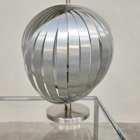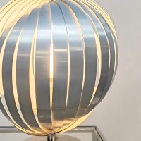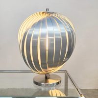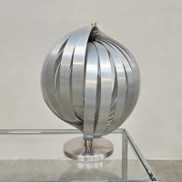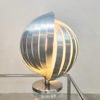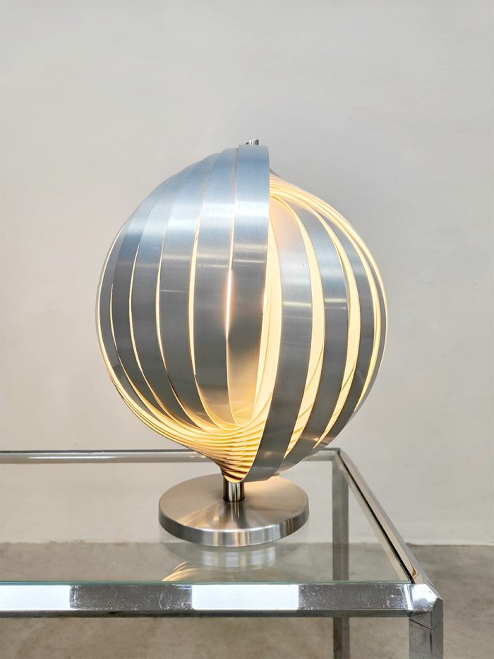 Unieke vintage tafellamp ontworpen door Henri Mathieu in de jaren ’70. De lamp valt op door zijn sculpturale vormgeving met aluminium lamellen die het licht op sfeervolle wijze verspreiden. Een iconisch stuk uit het Franse designverleden, perfect als blikvanger in elk interieur. Verlicht deze unieke lamp straks jou kamer?