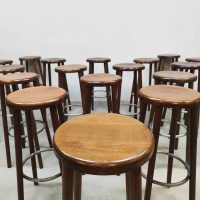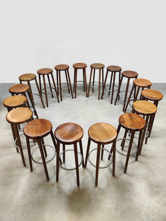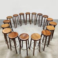 Take a seat… op een van deze stoere houten barkrukken. Land van herkomst: Frankrijk. Periode: 1970. Deze partij van 5 krukken is perfect voor aan het kookeiland of man cave. Doordat deze krukken redelijk smal zijn kunnen er veel krukken naast elkaar staan aan de bar. Deze krukken zijn mooi door zijn eenvoud. Gemaakt van hout en voorzien van een metalen voetring. Gezien de leeftijd is deze set in een goede vintage conditie. Bar time it is! Cheers.