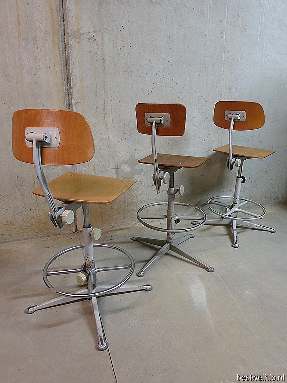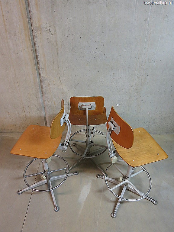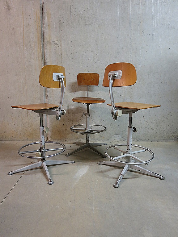 Stoere vintage krukken/ tekenkrukken/ barkrukken van Ahrend de Cirkel, een ontwerp van Friso Kramer (Holland) in de jaren 50. Alle krukken hebben een houten zitting, metalen onderstel en zijn in hoogte verstelbaar d.m.v. een draaiknop onder de zitting.Ook de rugleuning is verstelbaar. De knop is gemerkt met de tekst Ahrend de Cirkel. Twee krukken zijn identiek en zijn voorzien van een kunststof knop. Een kruk( de middelste op de foto ) is van een vroegere editie en heeft nog de metalen knop. Ontworpen als tekentafel kruk maar ook zeer mooi om bij te zetten aan een bar, geeft een stoere industriële look. Zowel de zitting als de ring aan de onderzijde van de kruk zijn in hoogte verstelbaar. Minimale hoogte is 58 cm, maximale hoogte is 72 cm en van de middelste kruk zelfs 78 cm. Allen nog in goede gebruikte vintage staat. Een zeer stevige, stoere & een onverwoestbare kruk. Ze worden steeds mooier hoe langer je ernaar kijkt. Prijs: verkocht